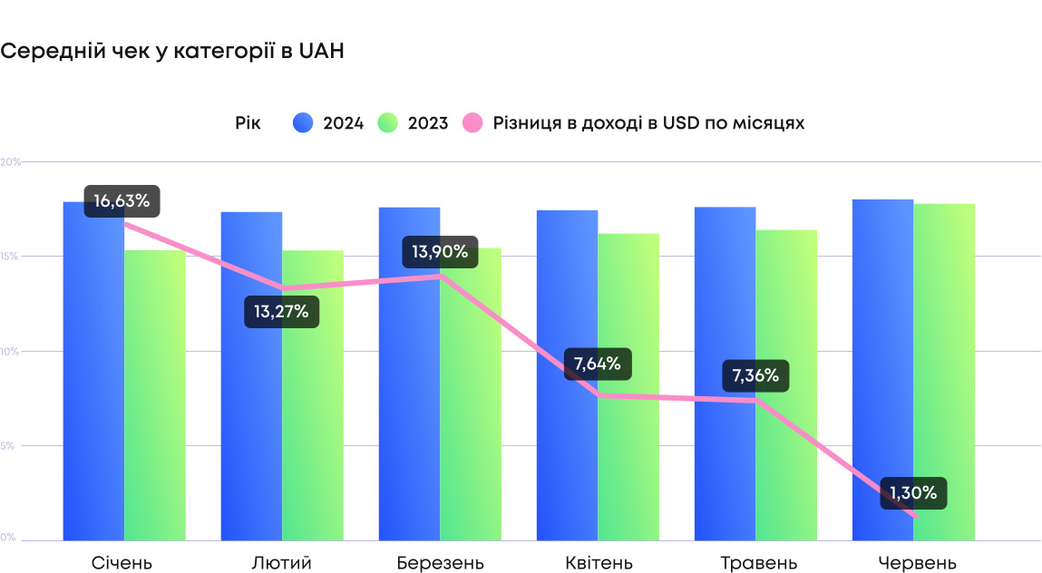 У доході у гривнях відбулося просідання на 11% порівняно з першим півріччям 2023-го, у долларовому еквіваленті цей показник ще більше – 13%. Кількість покупок також знизилася на 5%. Своєю чергою середній чек у доларах за перше півріччя виріс на 17%.