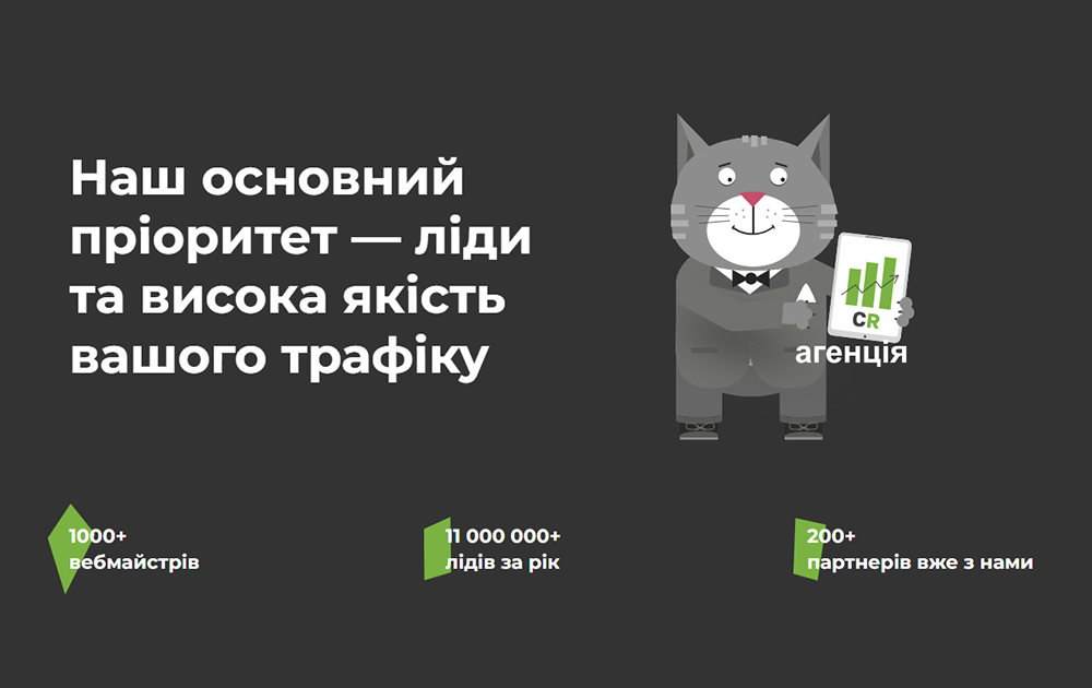 - Власна технологічна платформа. Команда постійно працює над новими рішеннями як для рекламодавців, так і для трафікових партнерів, що допомагає поліпшувати якість роботи та нарощувати об’єм трафіку по різним напрямкам.