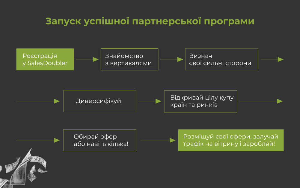 Для того, щоб розпочати та дізнатися більше, потрібно залишити заявку на сайті або зареєструватися як вебмайстер на офіційному сайті SalesDoubler і далі менеджери компанії швидко зможуть допомогти по вашим питанням.