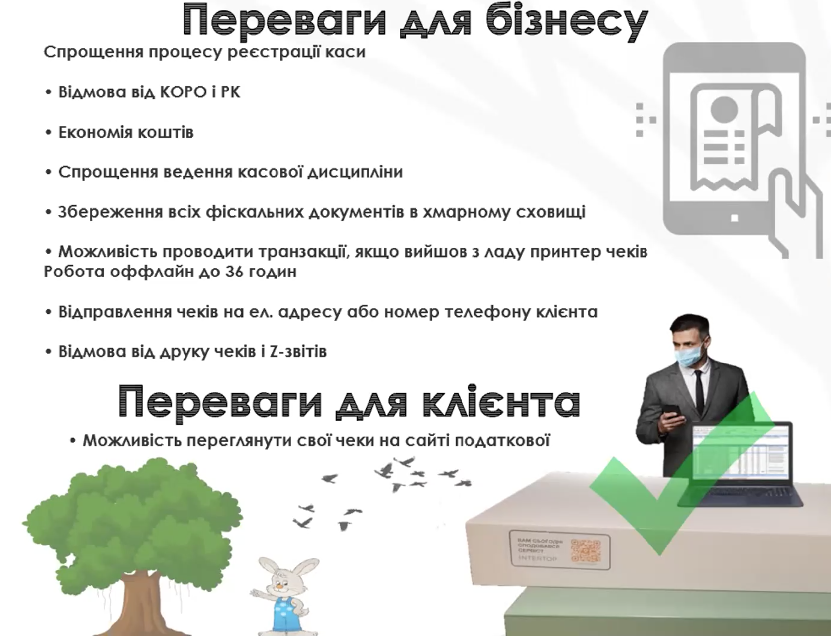 - екологічність. Програмний РРО дозволяє відмовитися від паперових чеків. До того ж, електронні чеки – це набагато зручніше. Вони завжди у клієнта “під рукою” і в будь-який момент можна отримати інформацію, яка там вказана (дату та місце покупки, внутрішній код і артикул товару і т. п.).