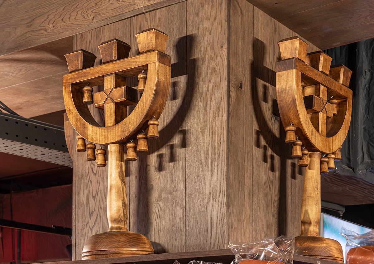 Щоб глибше дослідити тему, команда вирушила в експедиції до Косова, Коломиї та Криворівні, де знайомилась із майстрами, які зберігають давні ремесла, і надихалась місцями, де знімали “Тіні”. Цей підхід дозволив створити десять тематичних зон, які проводять відвідувачів крізь ключові сцени фільму. У кожній зоні оживають переосмислені образи зі стрічки, як-от ярмо зі сцени вінчанння — символ шлюбу за домовленістю, чи вогняні коні — алюзія на культову сцену смертельного поранення Петра Палійчука. Біля Гастрономії здіймаються трембіти — нагадування про музичний внесок народних музик і композитора Мирослава Скорика. Поруч — справжні артефакти оспіваної гуцульської культури: автентичний посуд, свічники-трійці, предмети побуту й меблі. Їх команда Сільпо знайшла під час експедицій до Коломиї та Косова. А над усім — знакові фрази з фільму, що світяться червоним неоном, мов багряні титри стрічки.