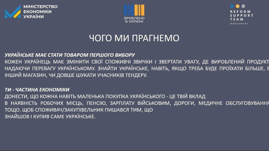 Додатково ця кампанія має змусити споживача замислитися, кому він платить свої гроші. За розрахунками Мінекономіки, в середньому по категорії товарів повсякденного споживання до 40% коштів, витрачених на покупку українського товару, повертається до бюджету країни. Натомість купівля, наприклад, іноземного сиру підтримує фермерів інших країн, які потім ще й блокують наш кордон.