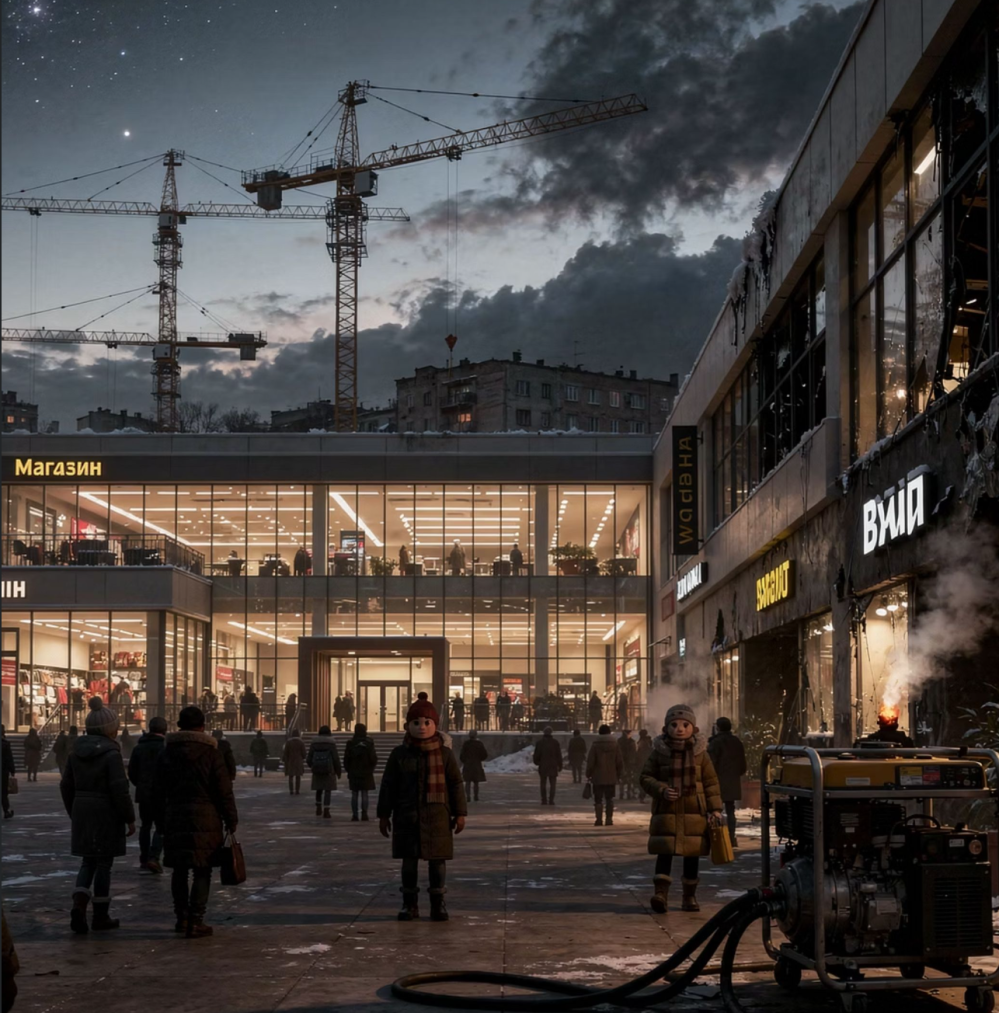 На початку свого виступу Максим Гаврюшин продемонстрував ілюстрацію від штучного інтелекту, яка відображала бачення ШІ щодо перспектив ринку торговельної нерухомості України у 2026 році. На цьому зображенні будівельні крани уособлюють відновлення будівництва після 2022 року, а тепле внутрішнє освітлення ТЦ слугує символом життєздатності ринку попри воєнні дії. Потік відвідувачів на картинці відображає позитивну динаміку індексу RWBI та відновлення споживчої активності. Наявність промислового генератора та зимовий одяг людей підкреслюють адаптацію галузі до енергетичних викликів і готовність забезпечувати роботу об’єктів навіть в умовах екстремальних холодів чи відключень електроенергії. Драматичне небо, що поєднує зірки та хмари, транслює синергію оптимістичних прогнозів і факторів невизначеності. Загальна концепція, запропонована ШІ, базується на поєднанні стійкості та тривоги: хоча ринок демонструє розвиток, питання наступного зимового сезону залишається відкритим.