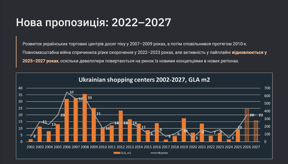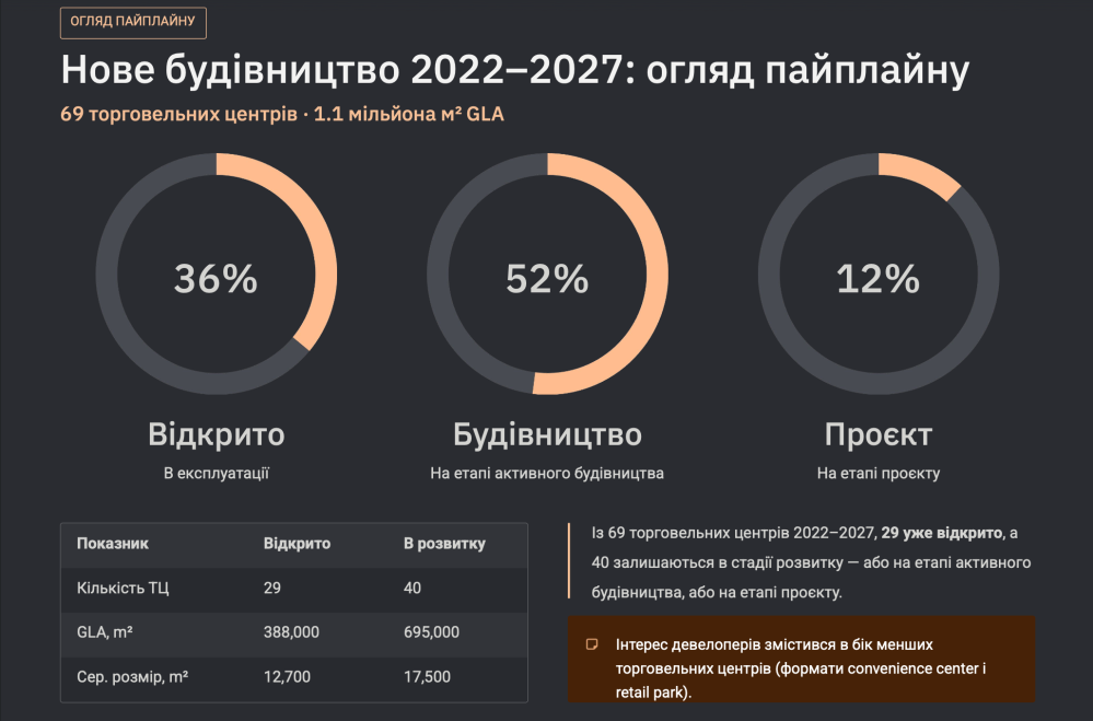 Попри наявні виклики, ринок торговельної нерухомості демонструє не лише стабілізацію, а й кількісне зростання. Протягом 2025 року було відкрито 10 нових об’єктів, а у період 2026–2027 років очікується введення в експлуатацію ще близько 40 торговельних центрів. Загалом, пайплайн на 2022–2027 роки налічує 69 об’єктів сумарною площею 1,1 млн кв. м GLA. Станом на сьогодні 36% із них уже функціонують, 52% перебувають на етапі активного будівництва, а 12% знаходяться на стадії проєктування.