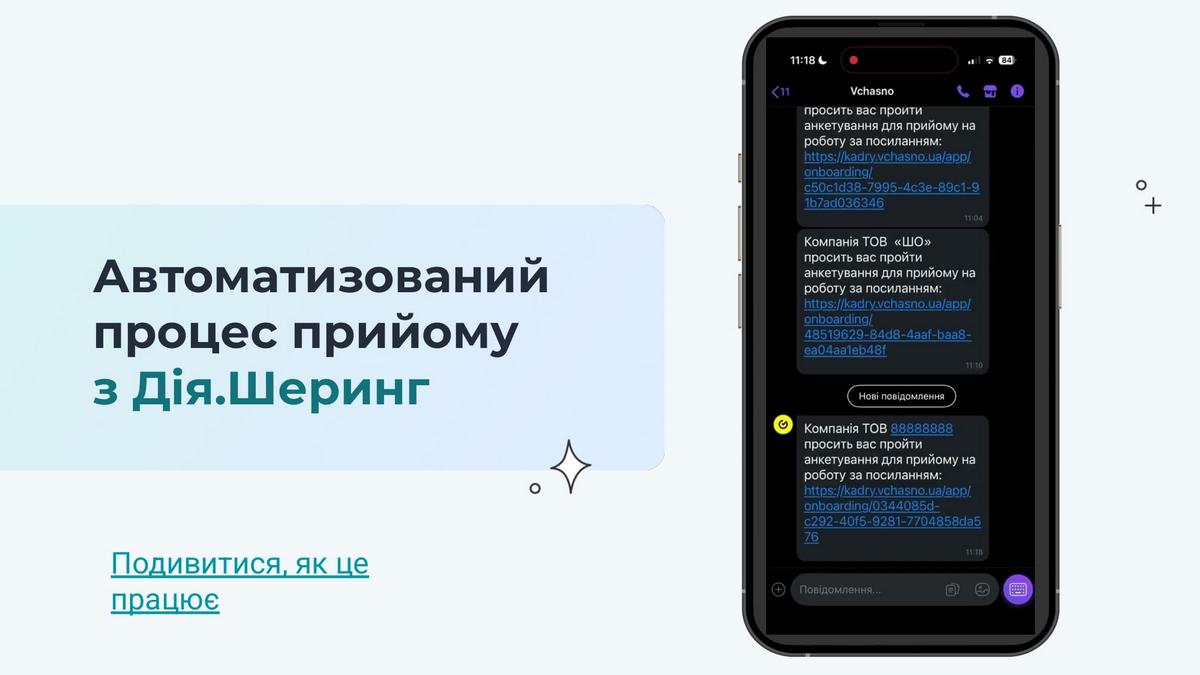 Спочатку кандидат надає мінімальну інформацію (e-mail, ПІП, телефон і т.д.) й отримує посилання на анкету, яку він має заповнити і поділитися через Дія.Шеринг своїми документами. Після отримання даних у компанії автоматично заповнюється заява про прийом на роботу та картка П2.