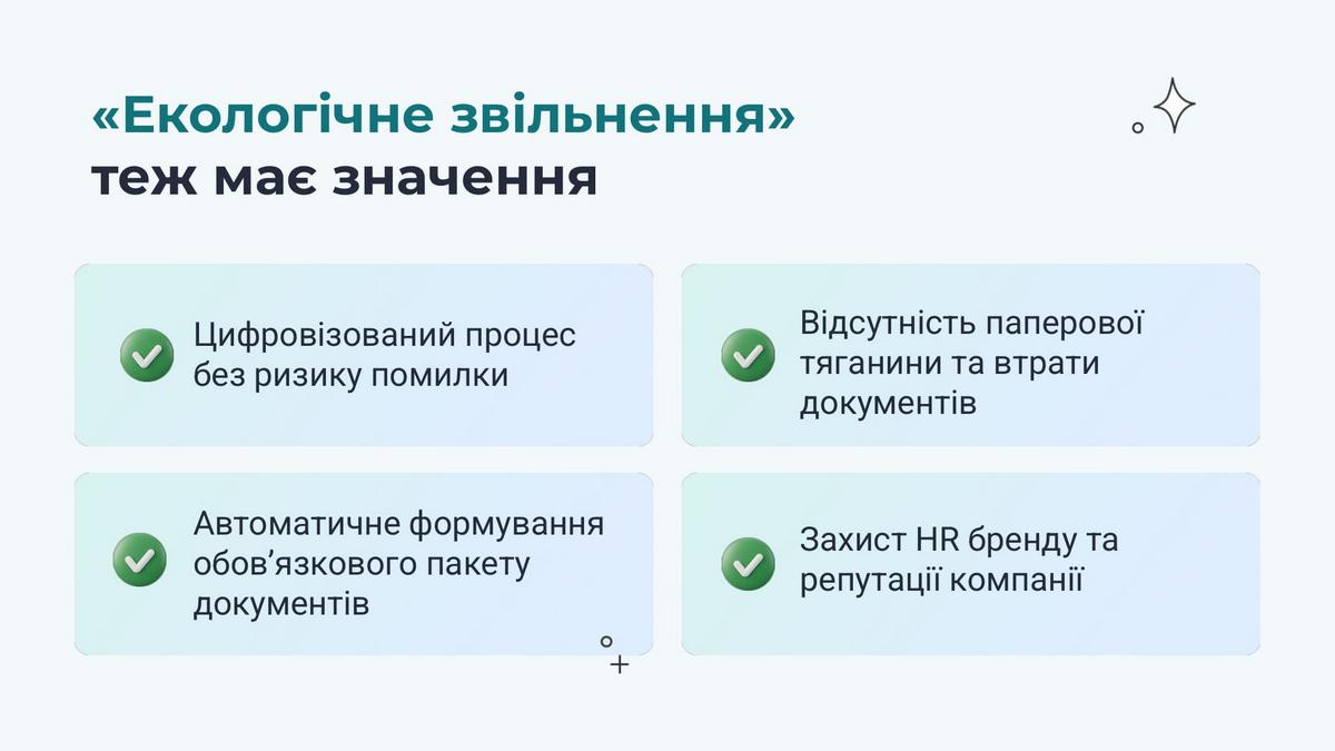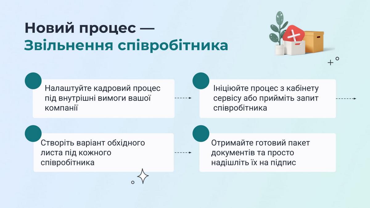 Також в компанії тестують і процес звільнення. Оскільки важливим є не тільки перше враження про компанія (прийом на роботу), але й останнє враження. І цей процес теж має бути гарним, якісним і, в першу чергу, екологічним, тому що знову йдеться про імідж бренду. Процес дуже схожий до прийому на роботу, але діє в зворотному порядку. Компанія формує в системі обов'язковий пакет документів і потім відбувається його підписання в застосунку. Також у Bayadera Group дали можливість налаштовувати обхідний лист, щоб процес був максимально релевантний під кожну особу, яка в цей момент звільняється.