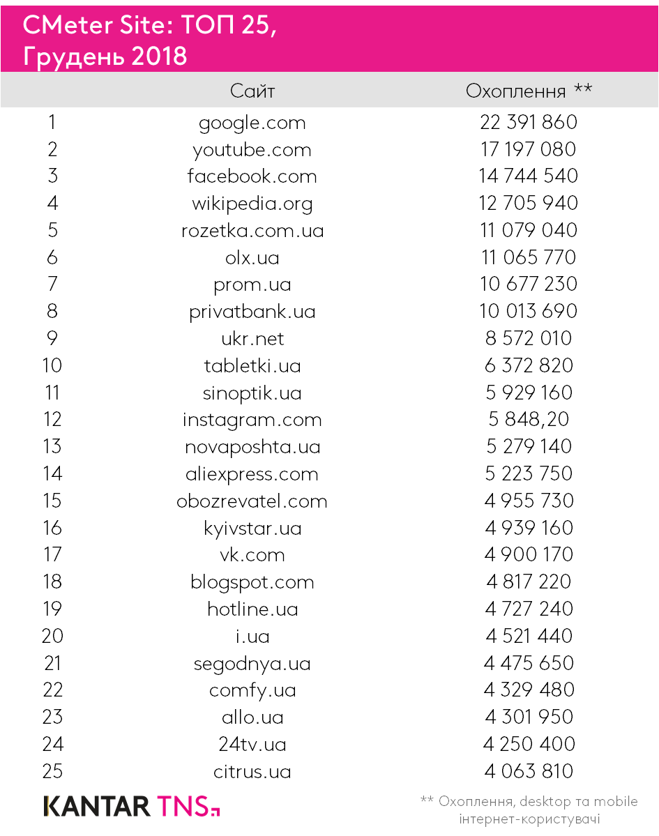 Згідно з даними чергового дослідження UAnet, проведеного TNS Ukraine, лідером українського сегмента Всесвітньої павутини залишається google.com. Також в топ-3 входять YouTube і Facebook.