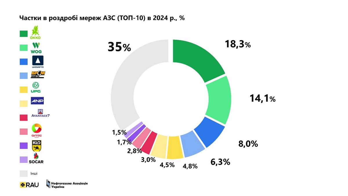 Я коротко розповім про оптову частину паливного ринку, давайте поговоримо з чого складається роздрібний сегмент. На діаграмі зображено топ-10 мереж за часткою роздрібного ринку в 2024 році. Ринок дуже, дуже конкурентний. Кожна з мереж має свою стратегію, свою ефективність, своїх прихильників. Безумовно, в 2025-му матимемо іншу картинку. З грудня 2024 року мережа ANP, фактично перестала працювати і АЗС вже півроку стоять «сухі». То ж її обсяги перерозподіляться між іншими мережами.
