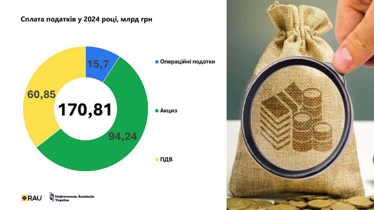 Загалом сплачено майже 170 млрд грн до бюджету. З чого складається це «пиріг»: це акциз – 92,8 млрд, ПДВ – 60,17 а також операційні податки – 15,7 млрд грн.