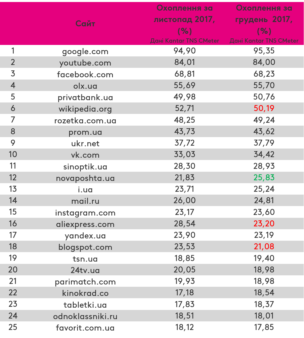 ТОП-25 популярних сайтів в грудні виглядає наступним чином: