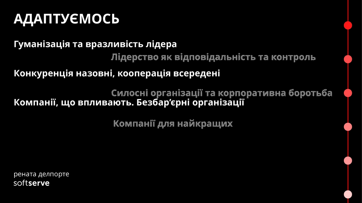 Важливо також обрати спосіб дій, щоб не витрачати сили на боротьбу з реальністю, а користуватися новими умовами для досягнення поставлених цілей. Наприклад, зараз лідерство змінилось, бізнес тяжіє до гібридних моделей роботи, але ефективність керівників досі часто вимірюють метриками минулого століття.