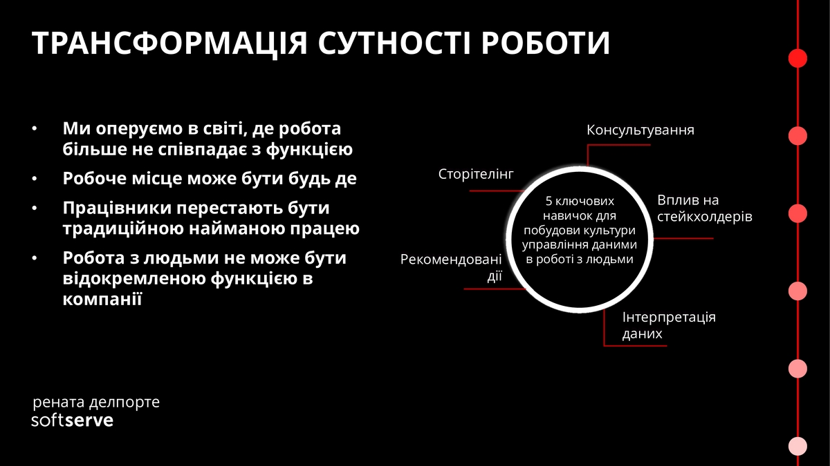 В сучасних умовах компанія роботодавець виглядає для пошукача як маркетплейс. Фахівець може продати свій час будь-де: в Rozetka, Olx чи де інде. Там, де йому буде вигідніше, цікавіше і передбачуваніше. Тому варто оцінити власний бізнес з точки зору цікавості для працевлаштування, особливо молоді. Відповідно змінюється культура роботи з даними у царині HR. Тобто це не стільки про управління заплатами, наприклад, а більше про інтерпретацію даних, рекомендовані дії, сторітелінг, консультування, вплив на стейколдерів.