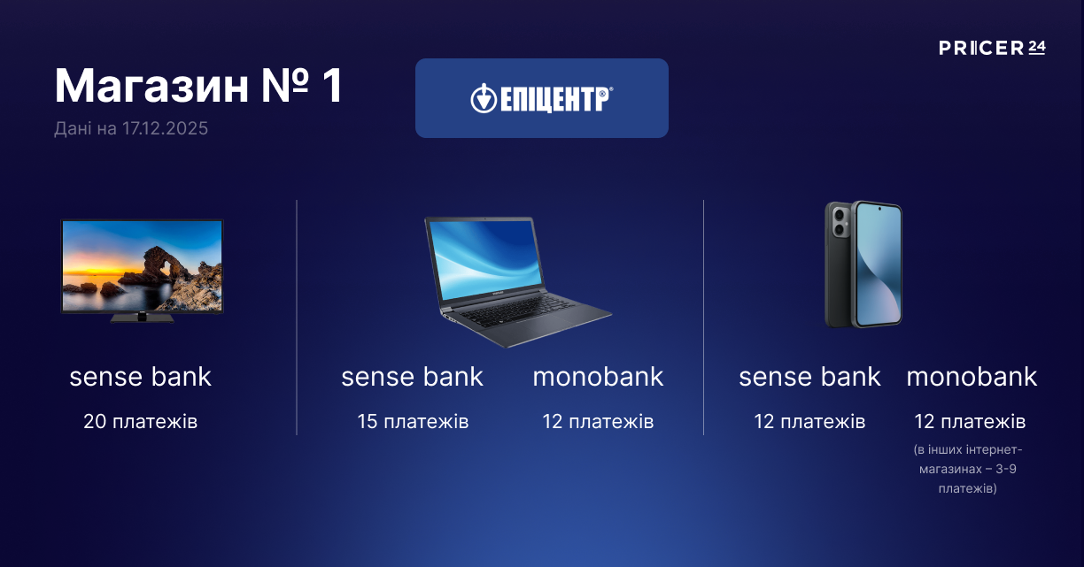 Sense Bank пропонує покупцям Епіцентру найтриваліші терміни розстрочки: у середньому 20 платежів на телевізори, 15 платежів на ноутбуки й 12 платежів на смартфони.