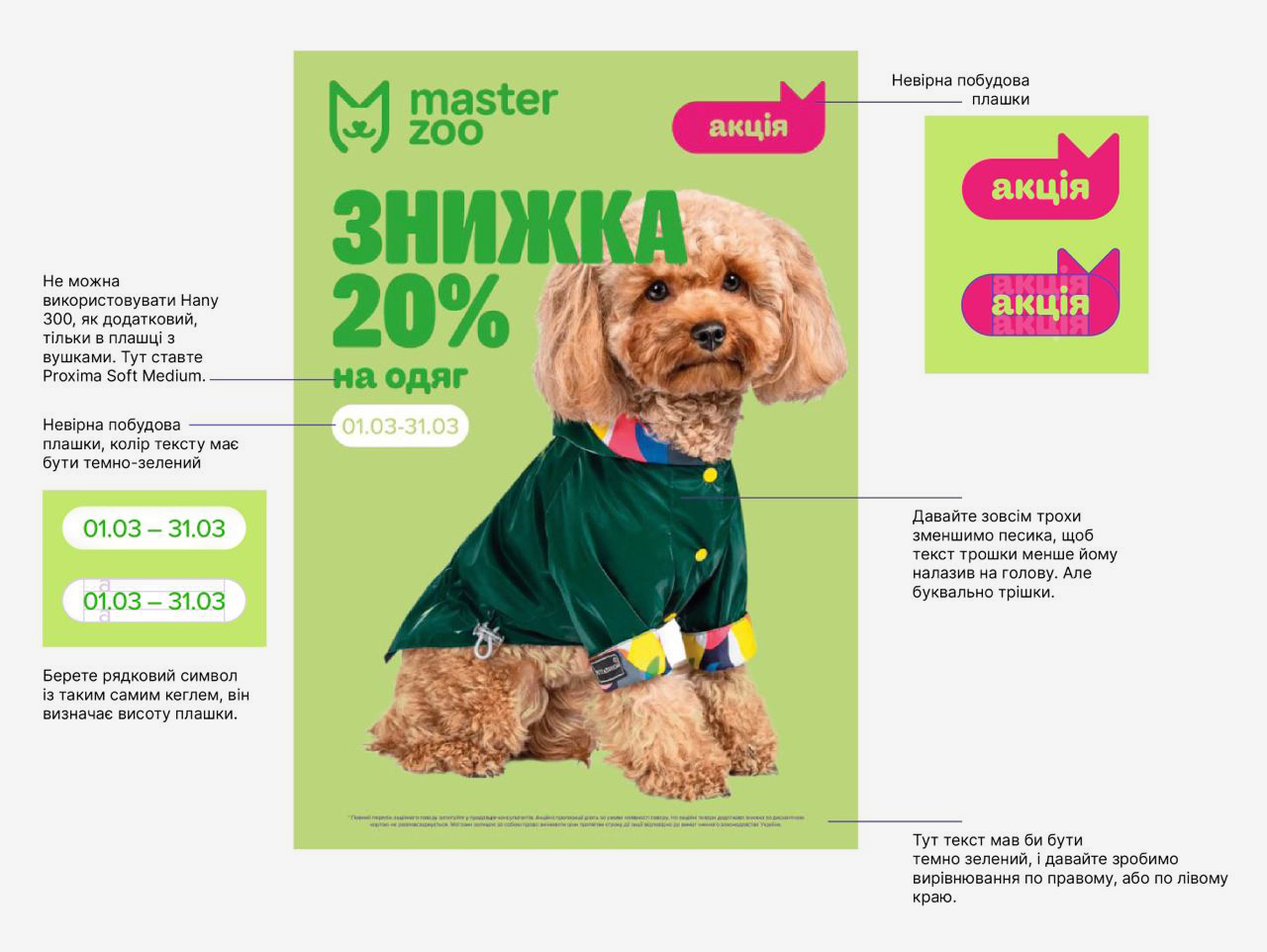 Наведу приклад на оновленні, яке ми зробили для мережі зоомаркетів MasterZoo. Ми повністю оновили кольорову палітру, шрифт, стиль ілюстрацій та верстки. Але при цьому дуже обережно, майже непомітно для кінцевого споживача, підправили логотип. У знаку-мордочці ми порівняли товщини, а в текстовій частині зробили однаковий розмір літер. Це дозволяє логотипу працювати краще у невеликих розмірах та бути більш читабельним на макетах. Але при цьому бренд не втратив своєї впізнаваності та не мусив негайно змінювати вивіски та брендинг в сотнях магазинів по всій Україні.