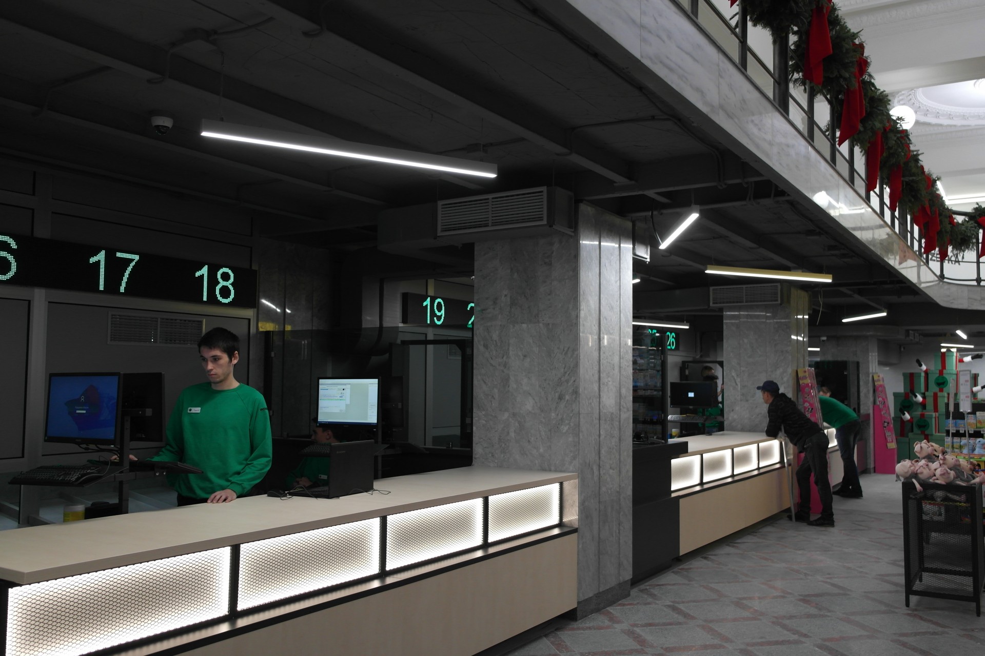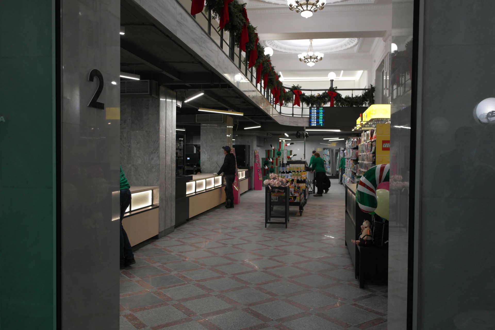 Мармурові підлоги, ліпнина, великовагові люстри, мозаїки на вікнах, властиві Головпоштамту з його довгою історією – все це залишилося. Однак рітейлер оновив всі приміщення, виділивши тематичні зони в залах з високими стелями, а також наповнив торговий простір світлом, візуально додавши простору там, де стелі недостатньо високі.