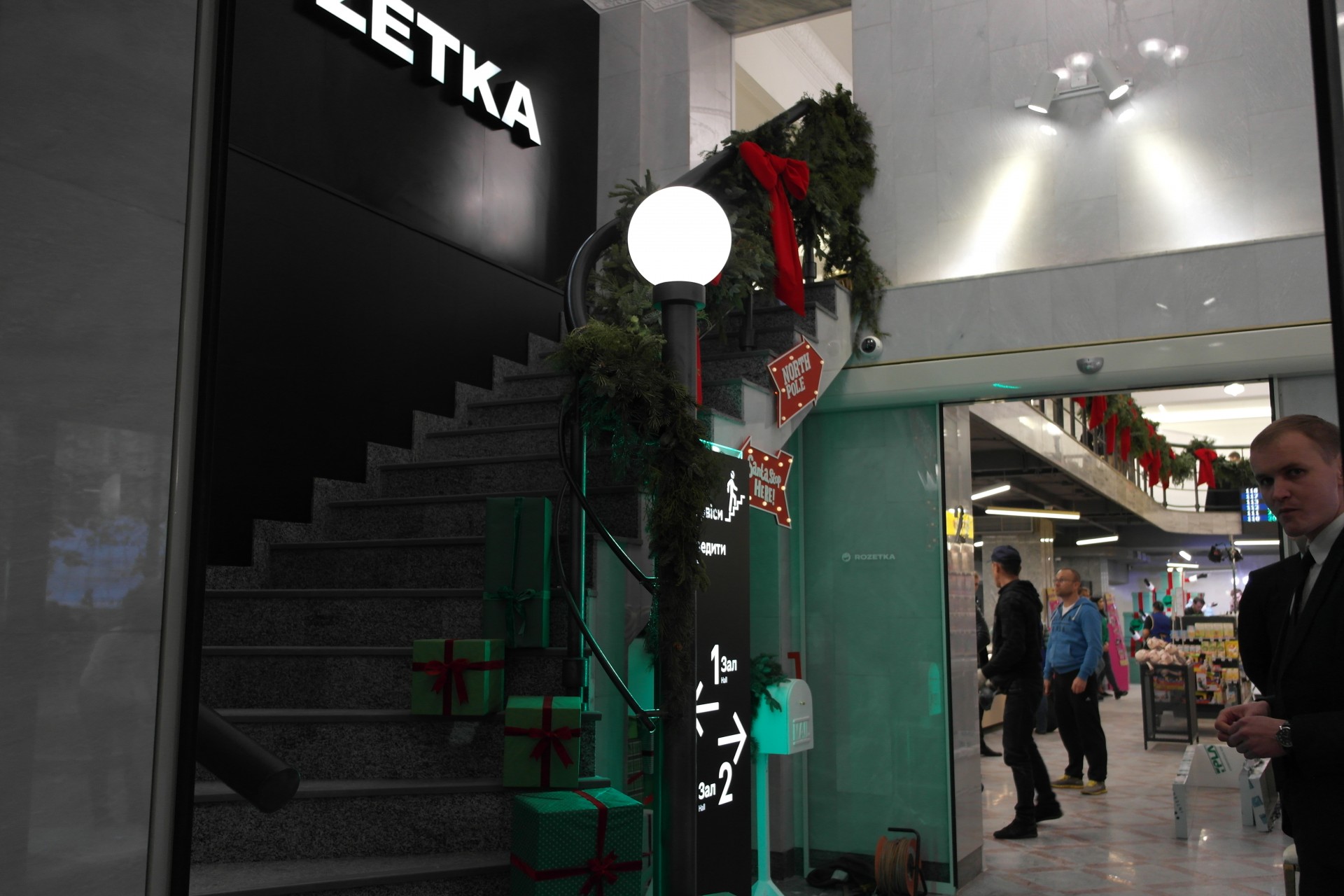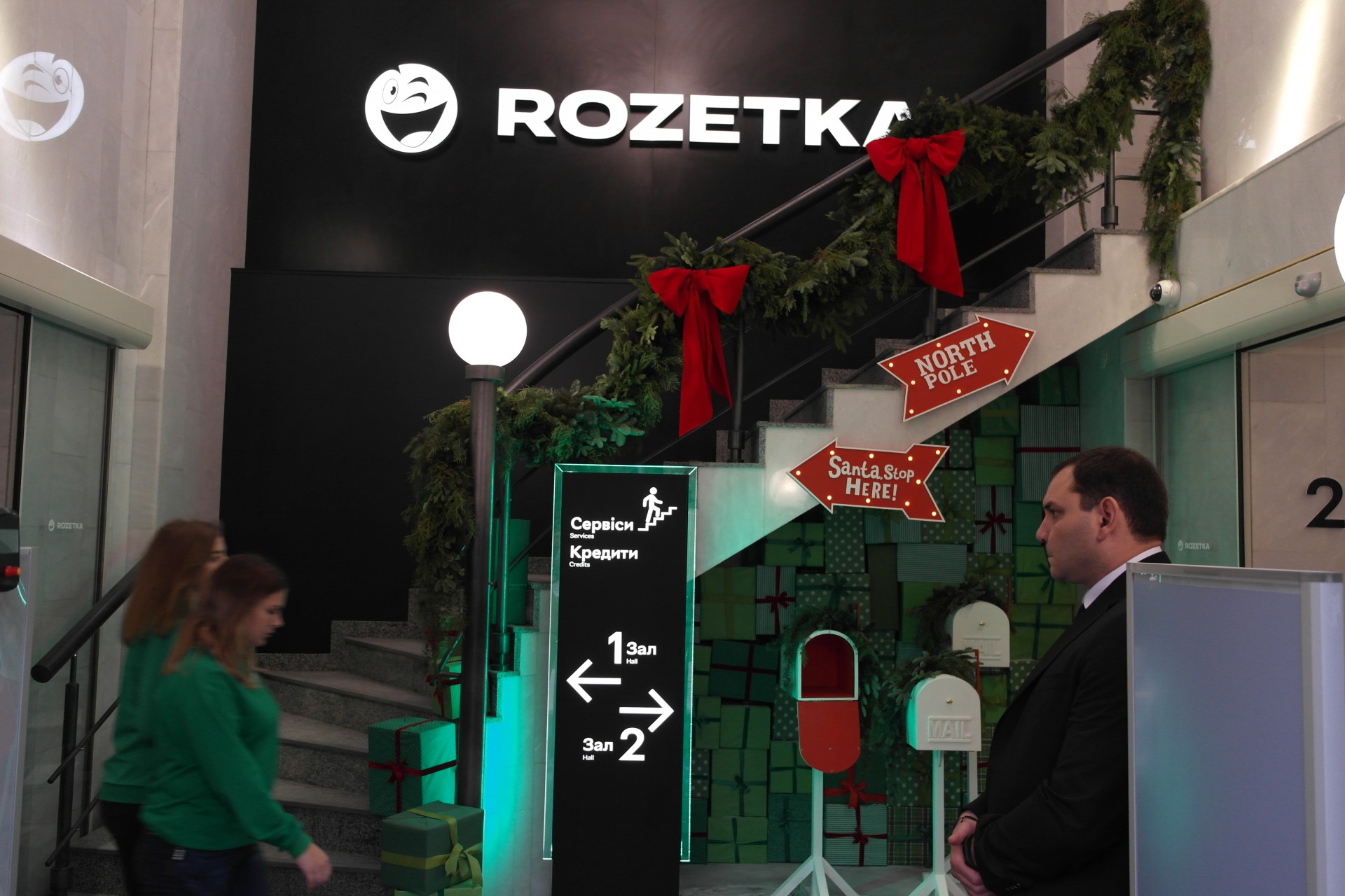 Зараз магазин оформлений в новорічному стилі, що напередодні свят не дивно. З входу відвідувачів зустрічає спеціальна фотозона, яких по всьому магазину досить багато. У цій зоні спеціальний “представник пошти Діда Мороза” буде приймати вітальні листівки, які будь-який гість Rozetka зможе відправити своїм друзям, родичам, або коханій людині.