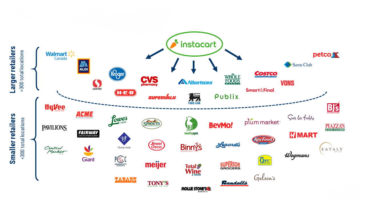 Так, наприклад, сервіс обслуговує клієнтів американських супермаркетів Costco, Wegmans, Kroger, німецьку мережу Aldi та багатьох інших. На малюнку вище ми можемо побачити, що Instacart працює не тільки з великими торговельними мережами, а й з середніми і малими рітейлерами. Таким чином, Instacart виграє, навіть якщо покупці переходять від одного бренду або роздрібного продавця до іншого.