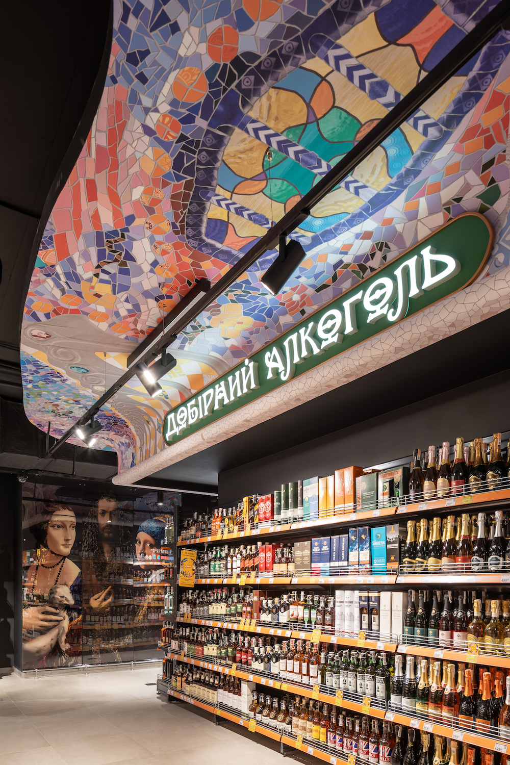 Мозаїка в магазині зустрічається не лише на стінах, а й на полицях. Її утворюють яскраві ряди соковитих овочів та фруктів. Візерунки зі свіжої, соленої й копченої рибки. Розмаїття страв з відділу кулінарії. Чудернацькі форми багетиків та округлі форми піци власного виробництва – все, як любив Гауді, без гострих кутів. Та все інше, що є невід’ємною частиною Сільпо.