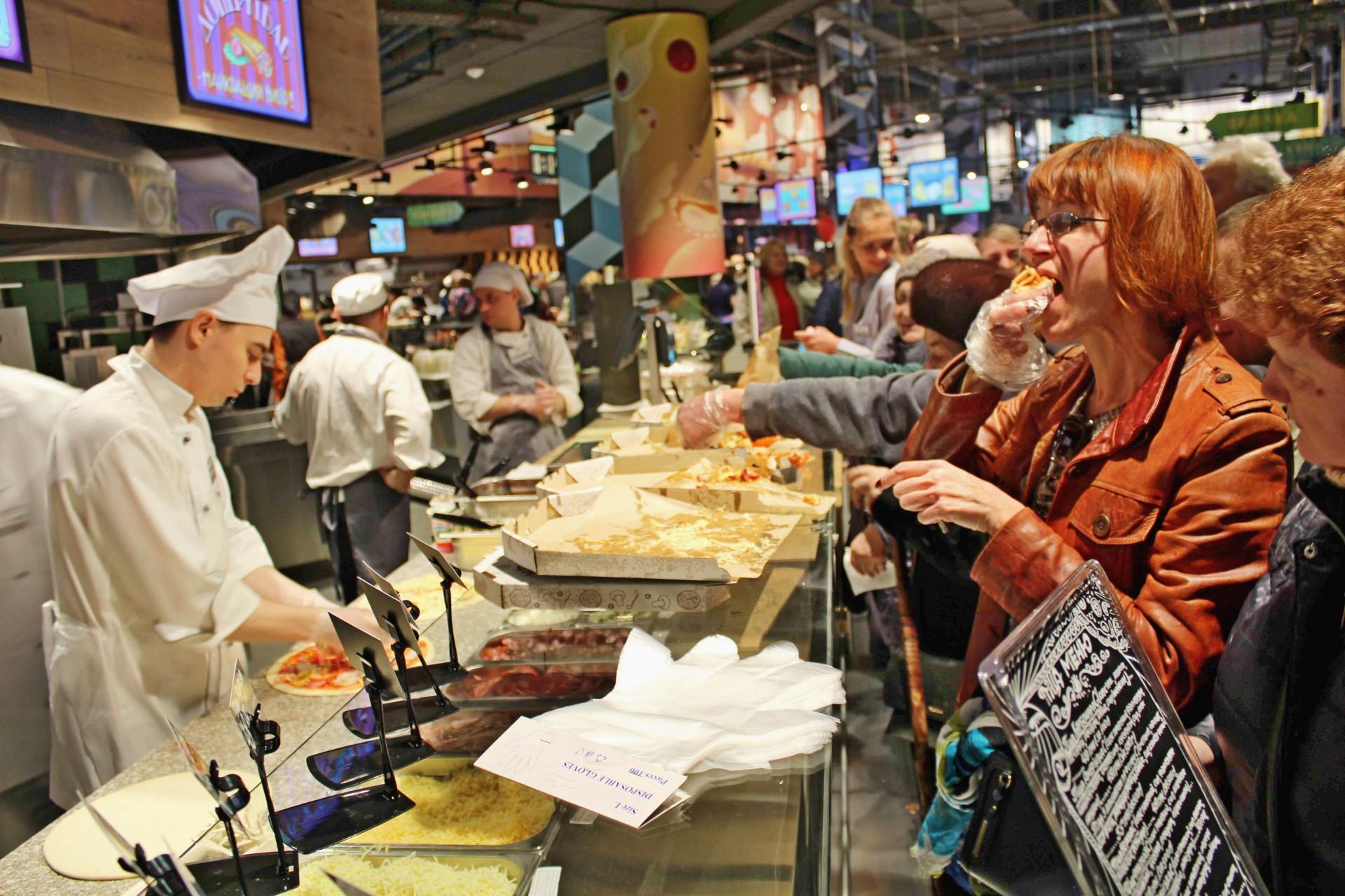 Зустрічав перших гостей супермаркет по-молодіжному: з дівчатами, загримованими у фантастичні рухомі фігури-ілюзії, оптичним шоу, діджеєм і розіграшами. Були і гастрономічні “розваги”, зокрема, дегустація в самих різних відділах, в тому числі, безкоштовно піца, що створило очікуваний ажиотаж і штовханину при напливі величезної кількості людей похилого віку і місцевих роззяв.