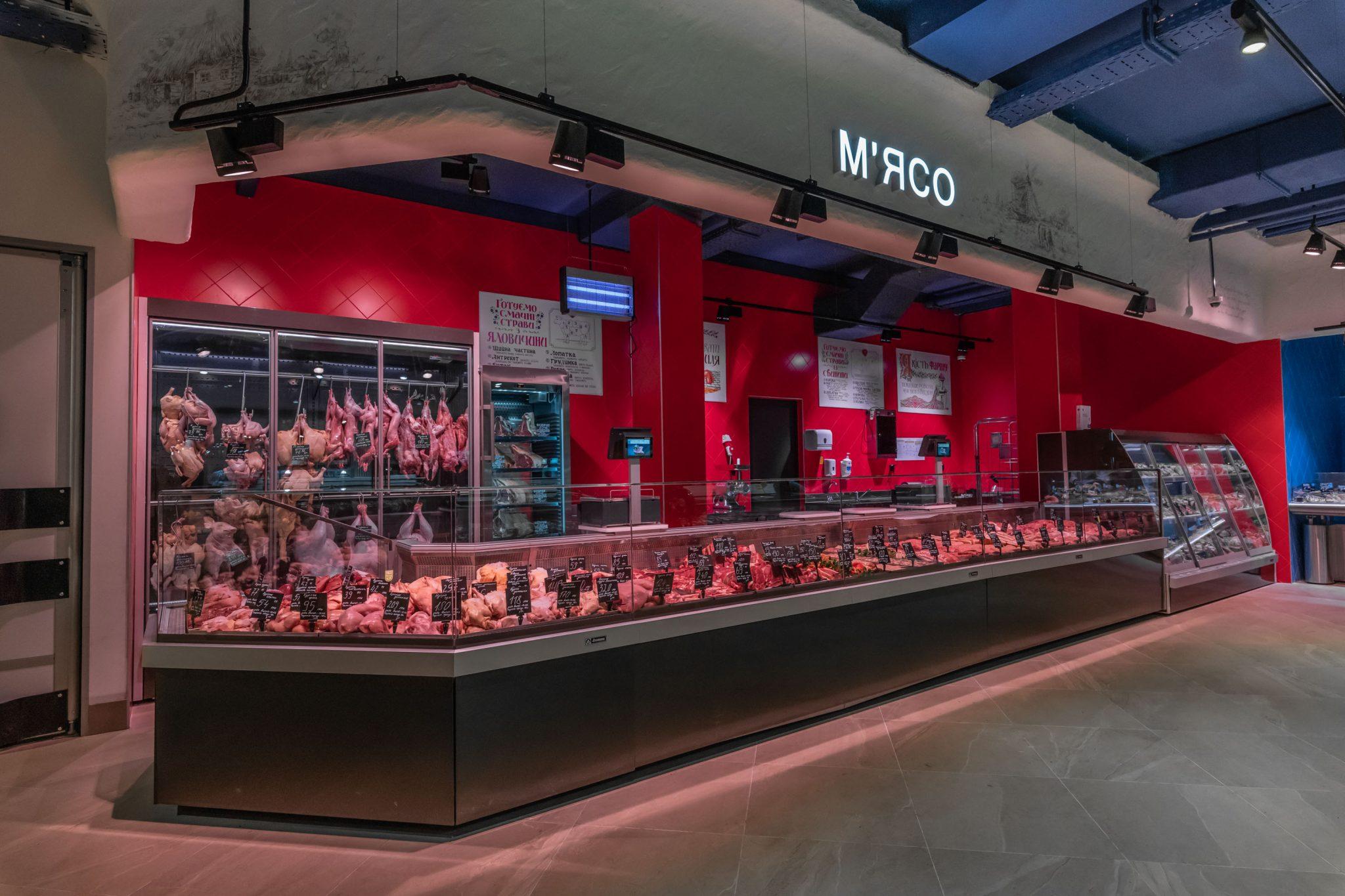 Апетитні м’ясні вирізки, стейки та інші вироби з м’яса представлені в широкому асортименті і грамотно підсвічені потрібними відтінками.