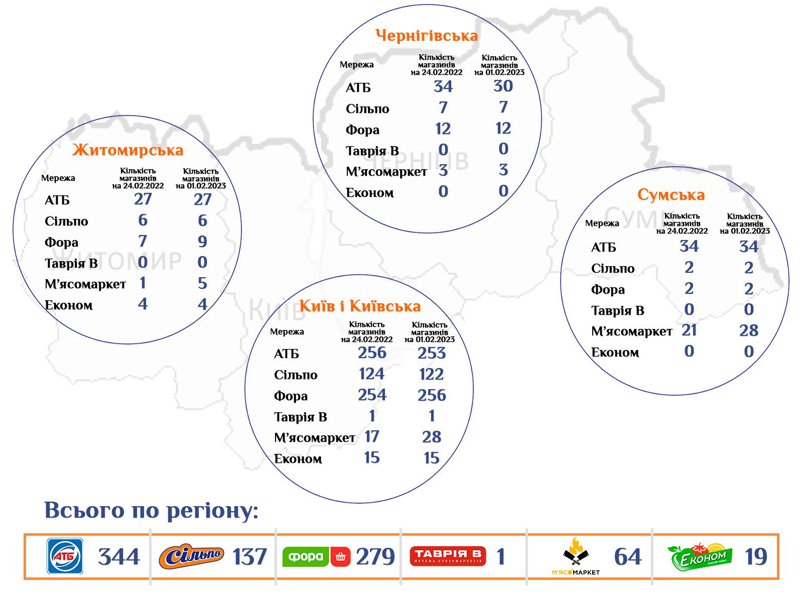 Найбільша концентрація рітейлу спостерігається в столичному регіоні, де зосереджено 253 магазини АТБ та 122 Сільпо. Це трохи менше ніж до війни. Так само основним регіоном присутності Фора лишається Київ та Київська область, хоча тут також планують розширювати присутність і в інших областях. «Наразі наша стратегія розвитку мало змінилась, ми так само прагнемо відкриватись скрізь, де це буде зручно для нашого гостя – стріт-рітейл чи ТРЦ – немає значення, аналізуємо кожну локацію окремо», – кажуть у мережі. Зокрема Фора розширила мережу в столиці зі 122 точок до 131. Проте в Київській області присутність знизилася на сім магазинів і тепер тут налічується всього 125 точок. Активний розвиток в Київському регіоні демонструє М’ясомаркет, який збільшив кількість магазинів у 1,5 рази. Також в столиці працюють магазин Космос (від компанії Таврія В) та 15 магазинів Економ.