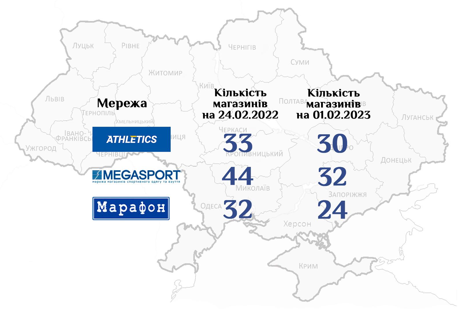 Усі спортивні мережі помітно скоротили свою присутність у східному регіоні України, де зараз ідуть запеклі бої з російськими окупантами. Так, мережа Athletics до війни мала два магазини у Харкові. На жаль, один з них був зруйнований ворожою ракетою, але інший продовжує працювати. Мережа Megasport після початку воєнного вторгнення закрила всі чотири магазини у Харкові, які наразі не відновили свою роботу. А мережа Марафон відновила три з п’яти магазинів у Харкові та, на жаль, втратила свою торгову точку у Маріуполі, який зараз окупована ворогом.