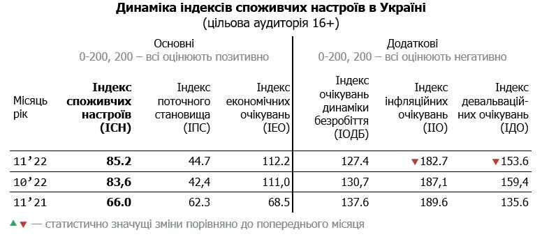 За даними дослідження Info Sapiens «Споживчі настрої в Україні», у листопаді 2022 року індекс споживчих настроїв (ІСН) склав 85,2 п, що на 1,6 п вище за показник жовтня. Індекс поточного становища (ІПС) зріс і складає 44,7, що на 2,3 п вище за рівень цього показника у жовтні. Складові цього індексу зазнали таких змін: