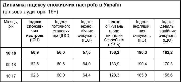 У жовтні 2018 року індекс споживчих настроїв (ІСН) склав 56,9, що на 5,7 п. менше за вересневий показник.