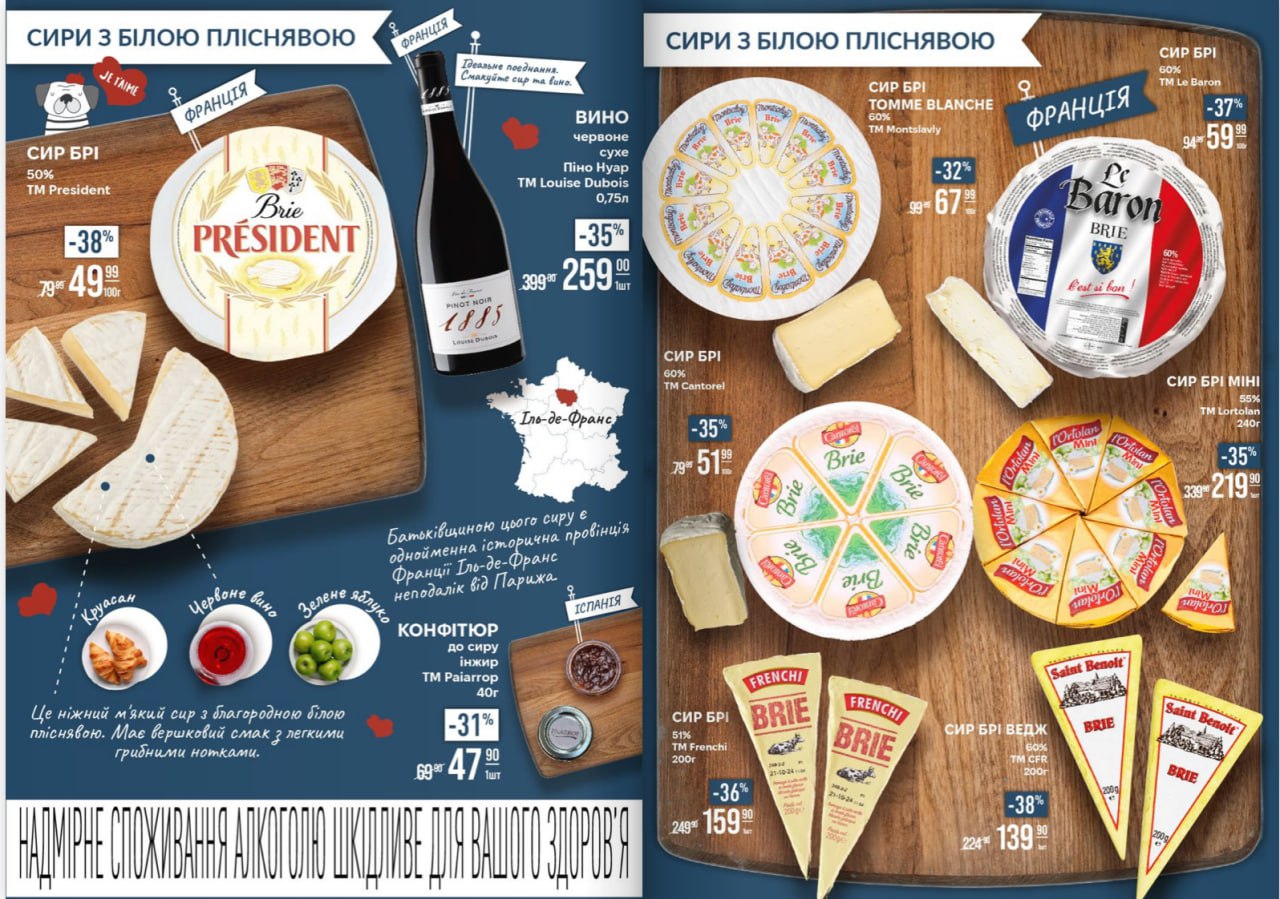 Підходьте до сирних столів, де буде проводитися дегустація різних видів сирів. Пробуйте сири та знаходьте свого фаворита. У тематичній листівці зібрані кращі пропозиції та знижки на імпортні сири, а ще там ви знайдете корисну інформацію про регіони виробництва та унікальні особливості кожного сиру.