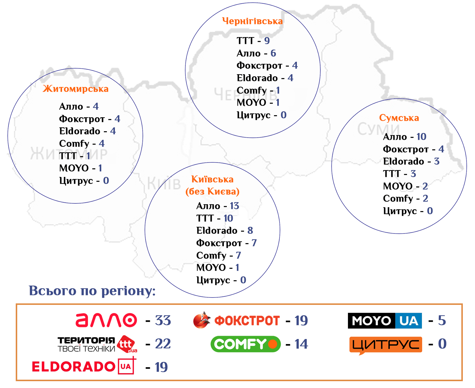 У цьому регіоні представлені всі оператори, окрім Цитрус, який відкрив магазини тільки в Києві. Лідер незмінний – мережа Алло, а другий рядок виявився у ТТТ, для якої північні області опинилися у фокусі уваги. Причому в Чернігівській вона навіть вийшла на перше місце.