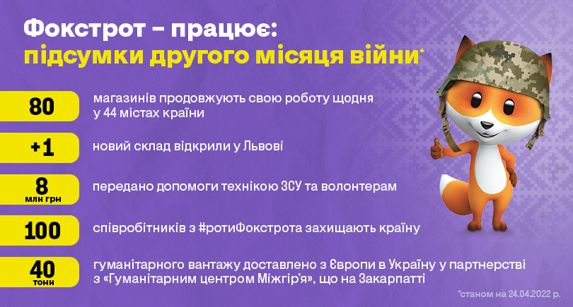 Мережа Фокстрот з перших днів війни підтримує країну як в тилу, так і на передовій. Відновила роботу більшої частини магазинів, надає допомогу військовим і волонтерам, спільно з партнерами організувала доставку гуманітарних вантажів в деокуповані області, а фокстротівська «сотня» з числа співробітників захищає державу в лавах ЗСУ та територіальній обороні.