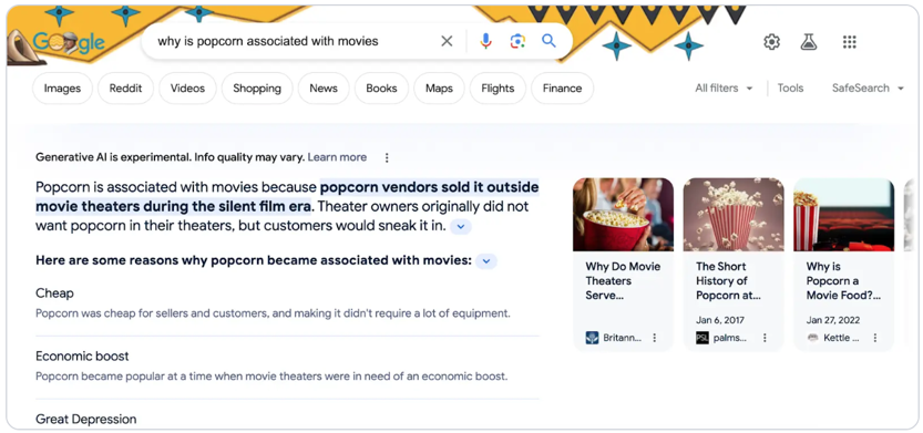 Згенерований фрагмент видачі, створений штучним інтелектом для SGE, містить посилання на релевантний контент і ресурси, з яких він, ймовірно, згенерував відповідь. Проте поки що незрозуміло, які саме фактори впливають на те, що ШІ обрав саме ці ресурси.