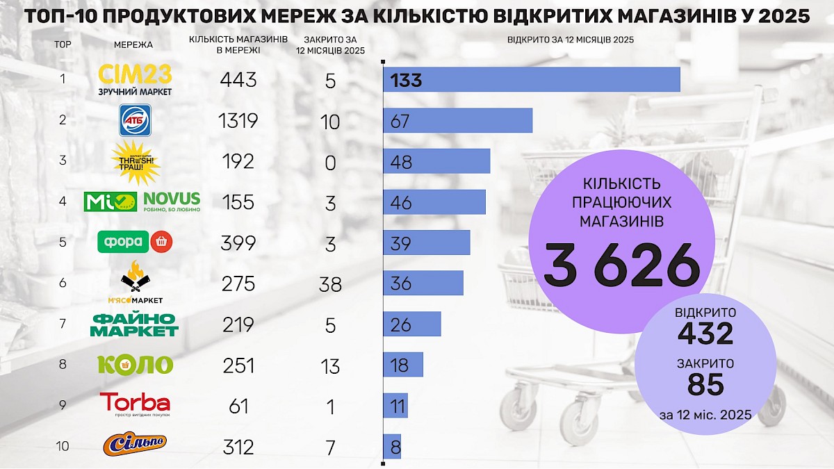 Топ-10 українських продуктових мереж за кількістю магазинів і темпами відкриттів у 2025 році