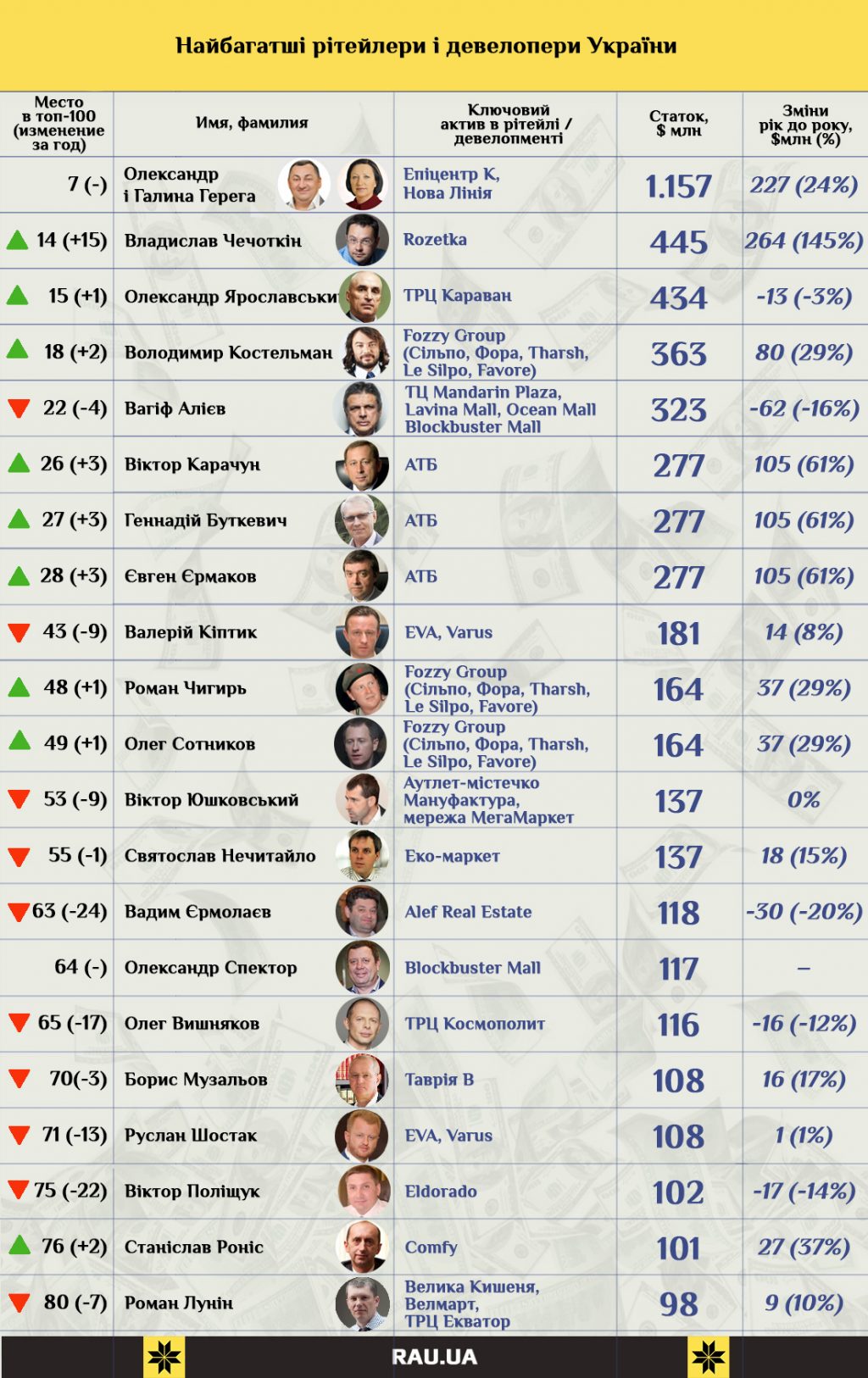 Редакція RAU проаналізувала складений список і вибрала з нього бізнесменів, що мають пряме відношення до рітейлу і девелопменту ТРЦ.