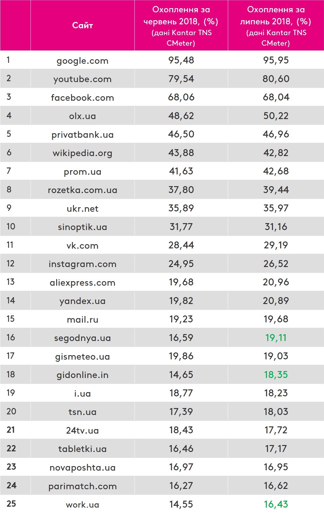 Частки інших гравців UANet не змінилися – в п’ятірці Olx знаходиться на 4 місці, хоча і збільшив частку майже на 2% – до 50,22, Prom.ua знаходиться на 7 місці, також на 1% збільшивши охоплення. Rozetka продовжує зростати – вона збільшила показник охоплення більш ніж на 1,5% – але цього виявилося недостатньо, щоб піднятися в рейтингу вище.