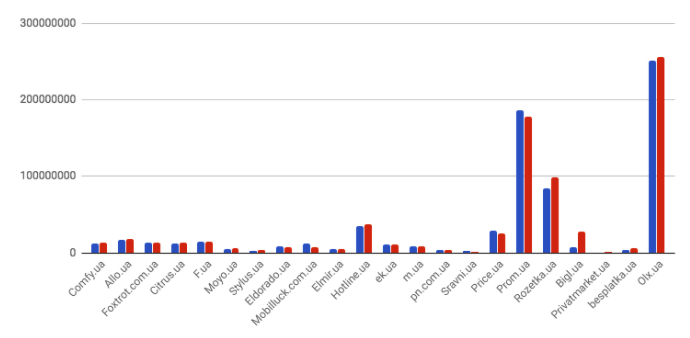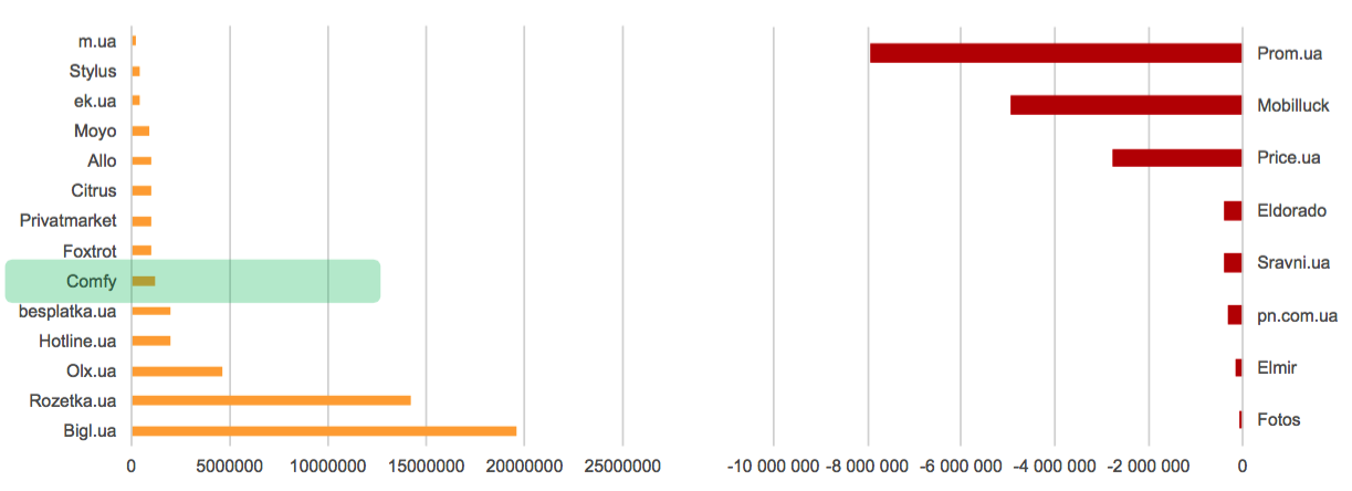 Кращі результати у категорії — Bigl.ua +19,6 млн, Rozetka +14,2 млн. Prom.ua «віддав» частина трафіку Bigl.ua.