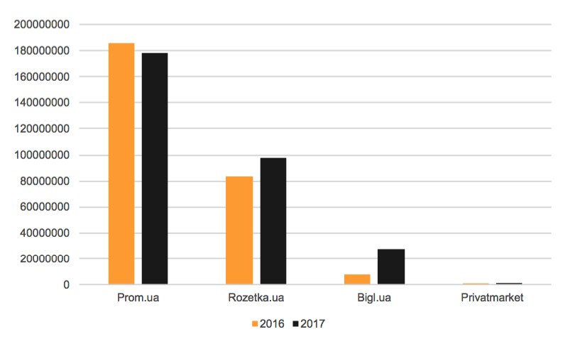 Сумарний трафік маркетплейсов в 2016 році – 194 млн або 278 млн з Rozetka. У 2017 році — 207 млн або 305 млн з Rozetka. Порівняно з 2016 трафік збільшився на 12,7 млн (+6,15%) або на 27 млн (+8,85 %) з Rozetka.