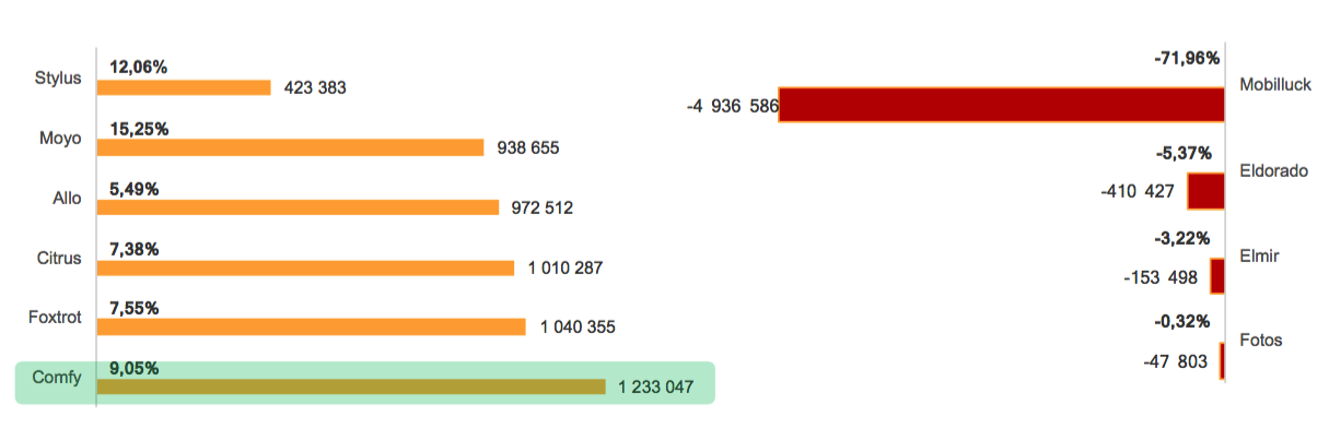 Найближчі конкуренти зросли приблизно на 1 млн трафіку. Приріст Comfy 1,233 млн, перший абсолютний результат і третій відносний. Хороші темпи зростання в Moyo +15,25 % та Stylus +12,06%.