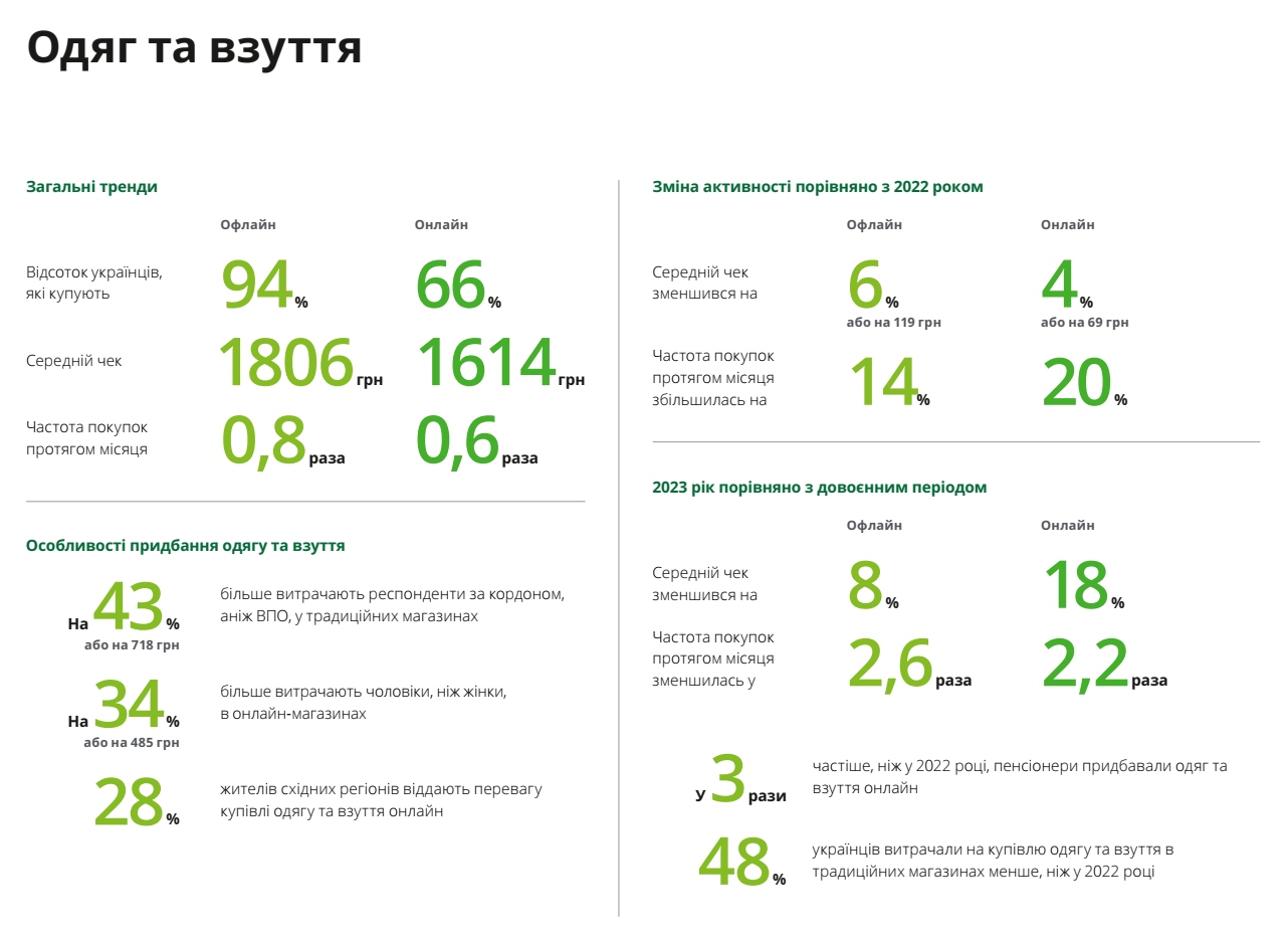 Традиційні магазини одягу та взуття відвідують 94% українців, але вже 66% щось купують і в інтернеті. Покупки роблять все частіше (+14% та 20% відповідно), але це все одно приблизно втричі менше, ніж у довоєнні часи. Проте покупка одягу онлайн стає актуальнішою там, де важче працювати звичайним магазинам. Зокрема, 28% жителів східних регіонів віддають перевагу купівлі одягу та взуття онлайн. Також утричі частіше, ніж у 2022 році, пенсіонери купували одяг та взуття онлайн. Важкі часи змушують економити, тому середній чек наразі менший, аніж навіть у 2022 році: 1806 грн та 1614 грн в офлайн та онлайн відповідно. Загалом 48% українців витрачали на купівлю одягу та взуття в традиційних магазинах менше, ніж у 2022 році.