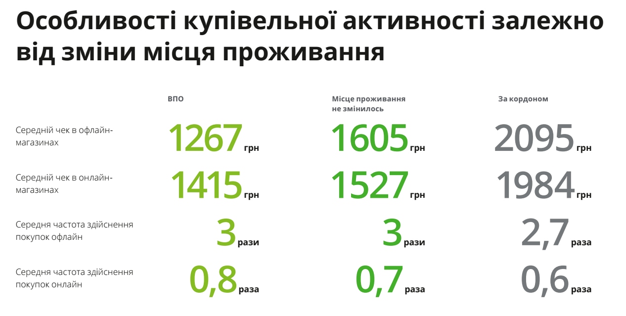 Розмір середнього чеку як онлайн так і офлайн залежить від місця перебування покупця. Так, найбільше витрачають українці, які виїхали за кордон – (2095 грн офлайн і 1984 грн онлайн). Ті, хто виїхав, є лідерами за частотою здійснення покупок та за розміром середнього чека в більшості категорій товарів. Водночас середня покупка українців, місце проживання яких не змінилось, як у офлайн-, так і в онлайн-магазинах приблизно на 30% менша. Ще менший чек у людей зі статусом ВПО як у офлайн-магазинах так і онлайн (1267 грн та 1415 грн відповідно). Проте зміни в частоті покупок та їх середньої вартості сильно залежать від конкретної категорії товару.