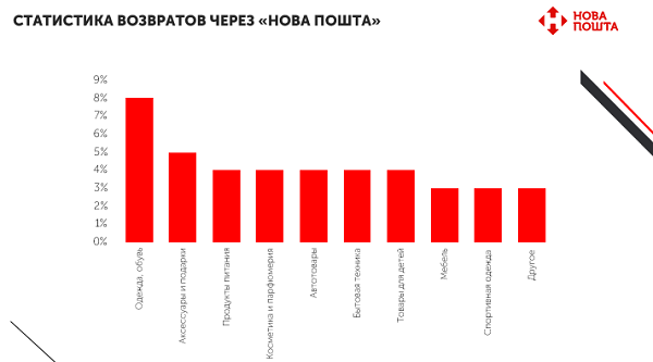Інфографіка НП: Що повертають найчастіше: одяг і взуття 8%, аксесуари і подарунки – 5%, продукти харчування, косметика та парфумерія, автотовари, побутова техніка і товари для дітей – 4%.