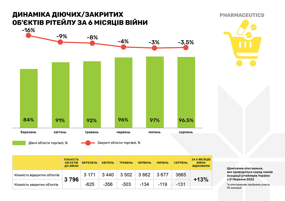 Найшвидше відновили роботу мереж майже до довоєнного рівня продавці ліків та медичних виробів. Частка працюючих точок мереж досягла відмітки у 96% вже в червні, а в серпні працювало вже 3665 аптечних закладів або 96,5% від 3796 точок, які були відкриті до початку повномасштабної війни. Таким чином частка непрацюючих аптек зменшилася з 16% у березні до 3,5% у серпні, або на 13%.