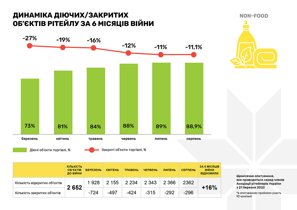 Серед усіх секторів рітейлу тільки у FMCG-операторів у квітні збільшилася кількість закритих магазинів з 978 до 1117 точок. Збільшення частки закритих мінімаркетів, супермаркетів, гіпермаркетів було пов’язане з оптимізацією роботи продуктових мереж. Рітейлери змушені були залишити в роботі лише ті точки, де можна сформувати повноцінний асортимент, організувати своєчасне поповнення запасів і мати відповідний споживацький попит. Проте надалі кількість працюючих магазинів почала зростати й досягла у серпні відмітки у 4273 магазинів проти 3463 у квітні, тим самим збільшивши їхню частку майже до 92% з 76% відповідно. Наразі не працює всього 397 продуктових торгових точок. Загалом частка непрацюючих магазинів за шість місяців війни скоротилася на 12%.