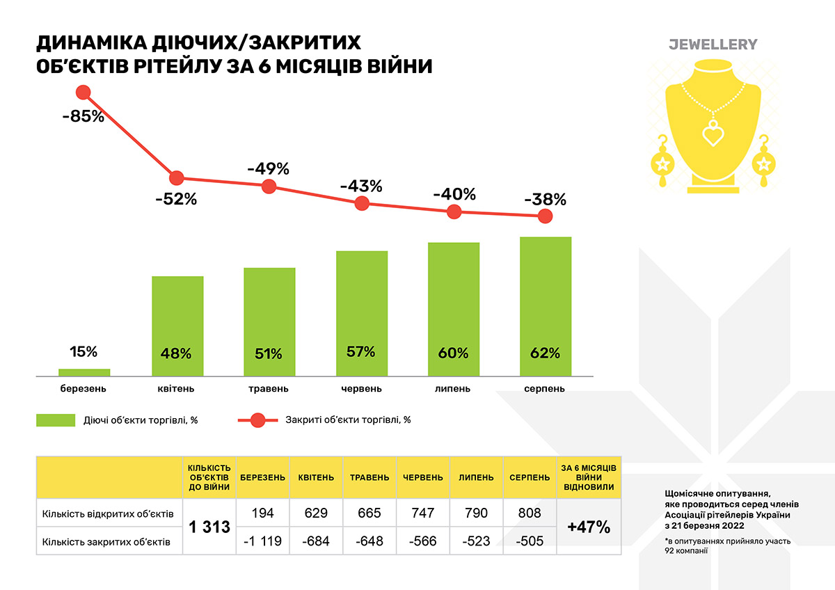 На відміну від споживчих товарів сектор jewelry був одним із тих, хто втратив на початку найбільше. Так, у перший місяць бойових дій залишились відкритими всього 194 із 1313 торгових точок, або лише 15%. Тому й відновлення у серпні до 808 відкритих магазинів або 62% виглядає масштабним досягненням. Загалом із березня до серпня кількість заново відкритих магазинів збільшилася на 47%. Наразі не працює 505 торгових точки, що на 18 магазинів менше, ніж у липні. Зазначимо, що майже половина точок торгівлі ювелірними виробами відновилася ще в квітні, а потім лише поступово та впевнено збільшувала частку працюючих магазинів.