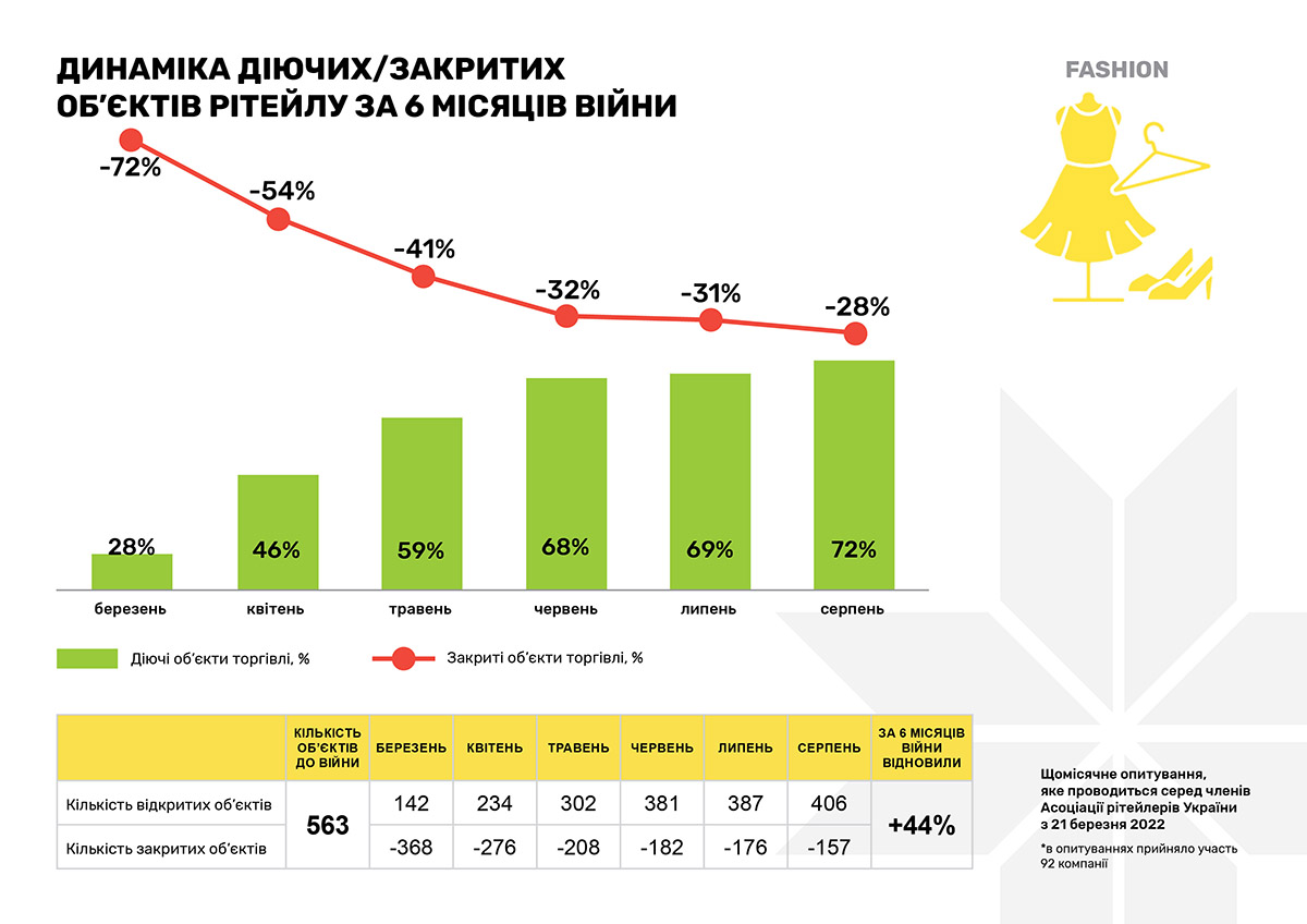 Чергове дослідження, яке провела RAU методом онлайн-опитування приблизно сотні власників та CEO підприємств по всій Україні, показало, що на 20 серпня 2022 року було закрито з тих чи інших причин тільки 12% торгових об’єктів/магазинів. Це всього на 1% менше, ніж місяць тому, але порівняно із березнем, коли не працювала майже третина торгових точок (29%), це вже набагато кращий результат.