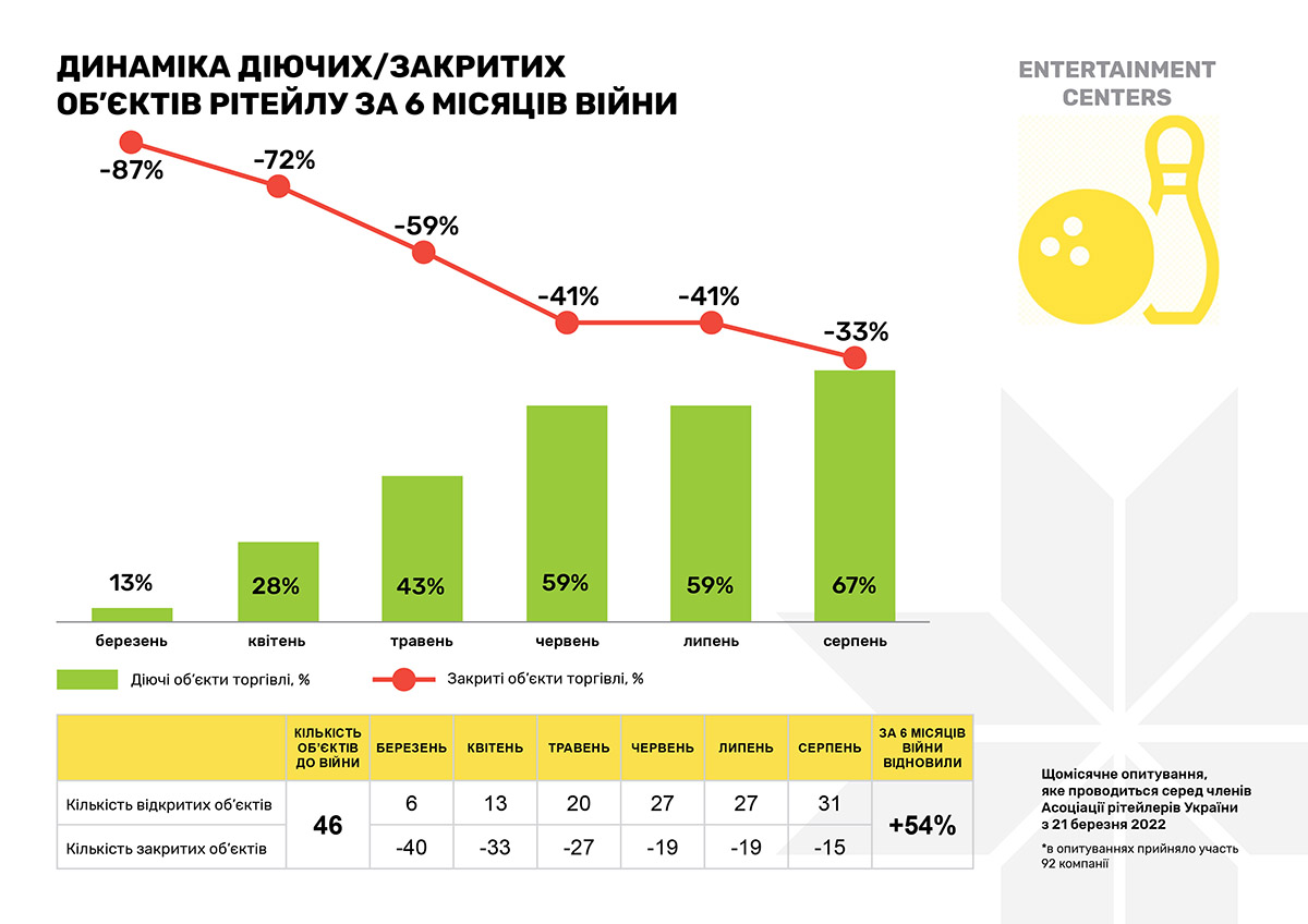 Розважальні центри виглядають найбільше постраждалим сектором торгівлі під час великої війни. Так, у березні 2022-го лишилося працювати всього 13%, або 6 із 46 об’єктів. Тому й відновлення роботи через шість місяців виглядає дуже значимим. Так, у серпні вже працював 31 об’єкт, або 67% від загальної кількості. Тобто на 54% збільшилася їх частка.
