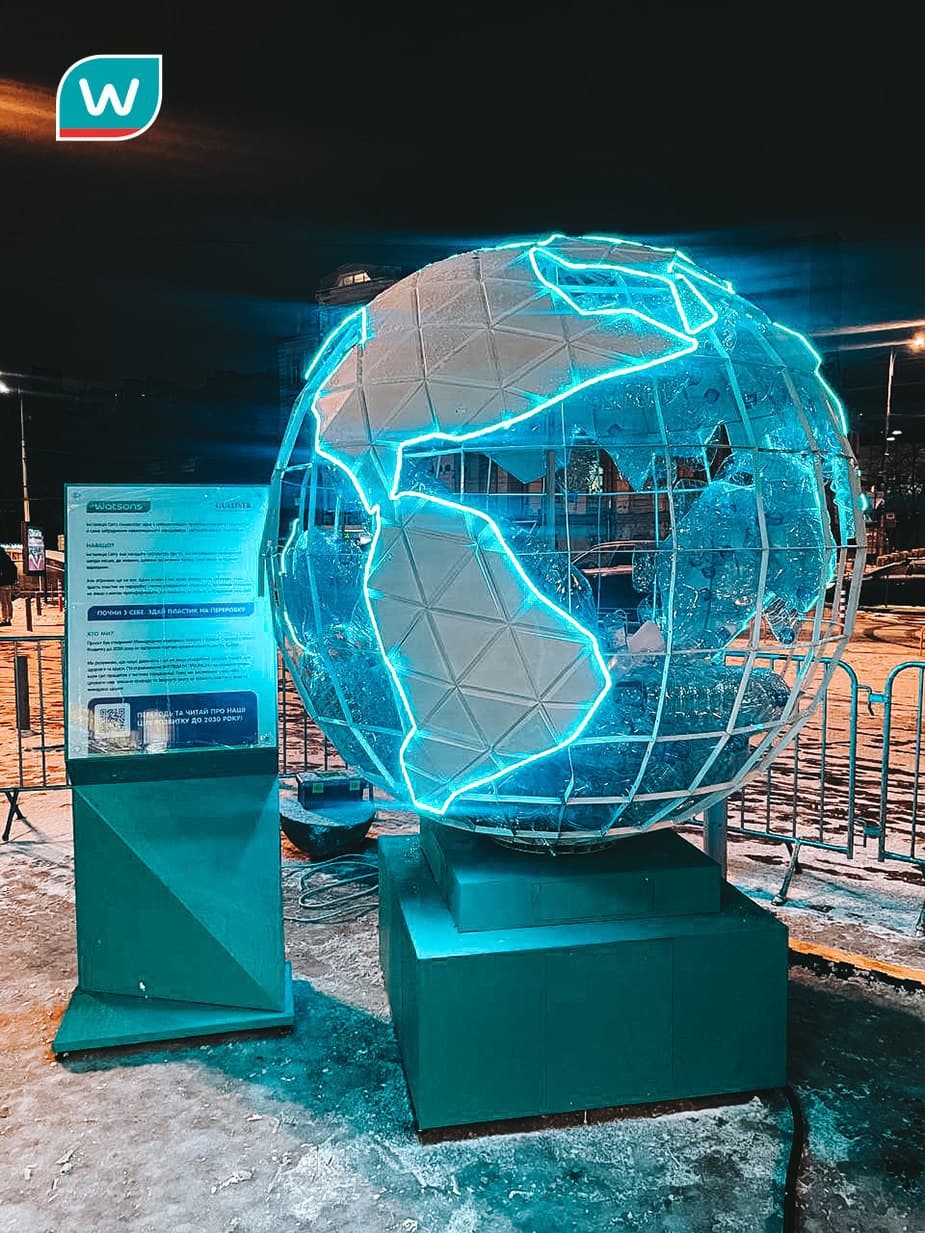 Цікаво, що весь пластик, який знаходиться всередені планети зібрали працівники головного офісу Watsons, адже згідно з філософією бренду, кожен Head Office має максимально скоротити токсичні відходи та піклуватися про довкілля.