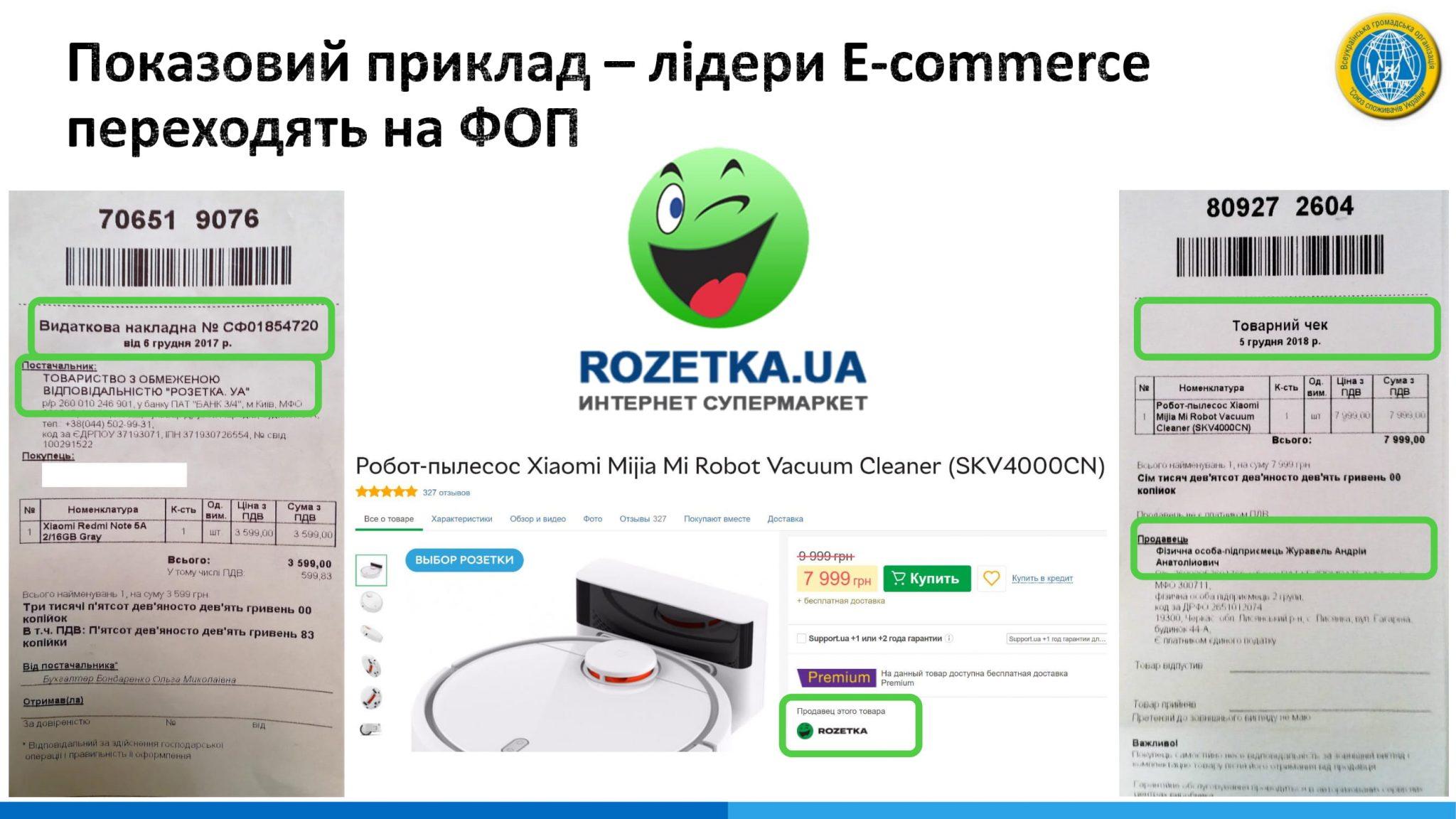 Союз споживачів України вирішив перевірити, чи мають всі ці ФОП реєстрацію, і наскільки законно вони працюють. В результаті з’ясувалося, що КВЕД 47.91 (код діяльності, який дозволяє ведення економічної діяльності в мережі інтернет), був тільки у 6-ти продавців. Лідер ринку – магазин Rozetka (ФОП Журавель) взагалі не має такого КВЕД.