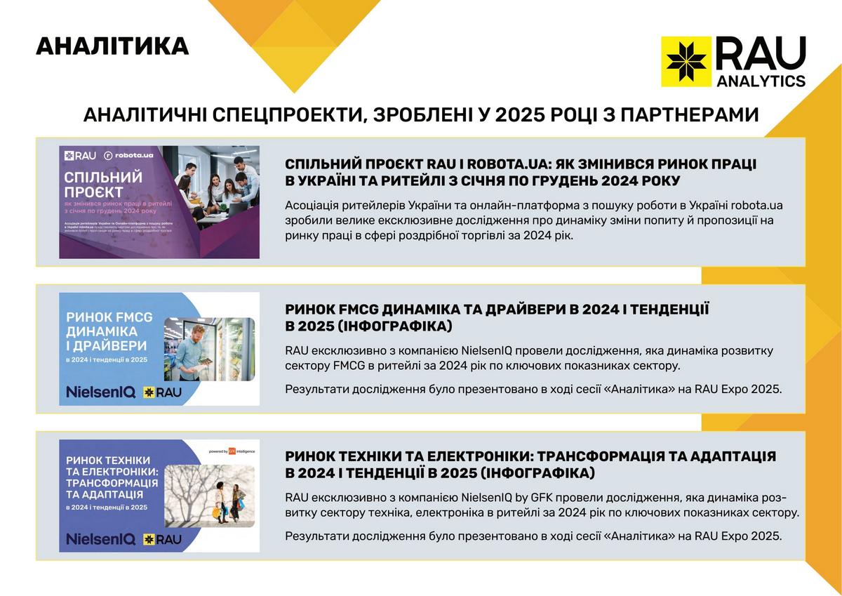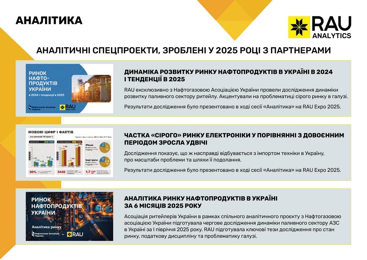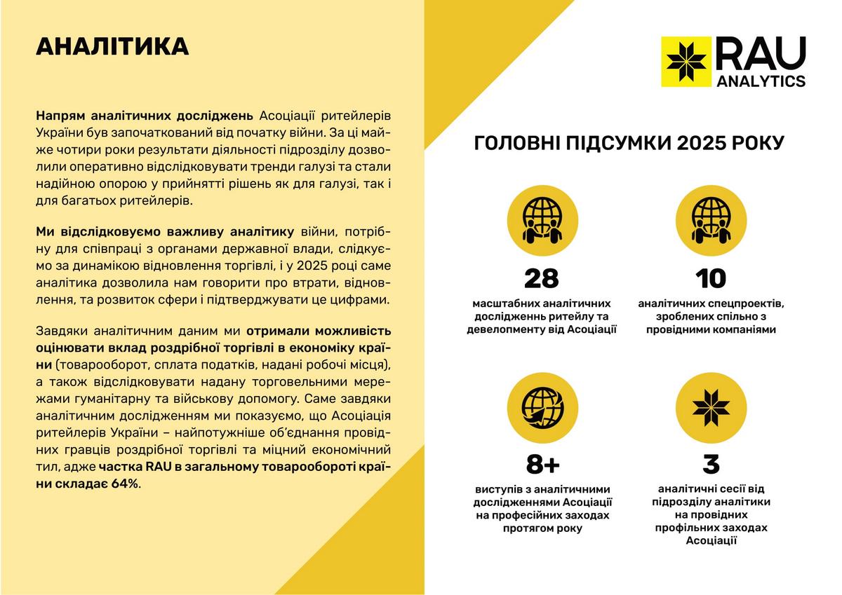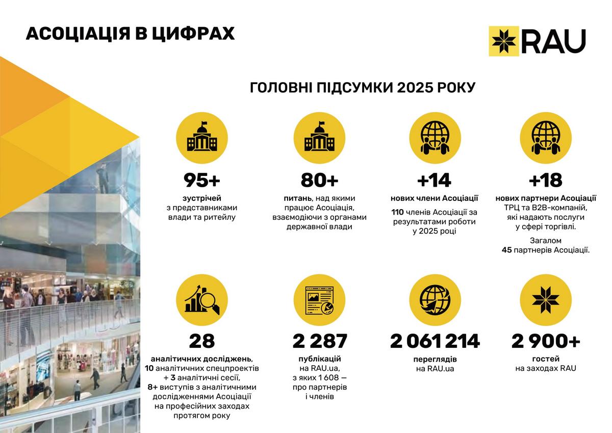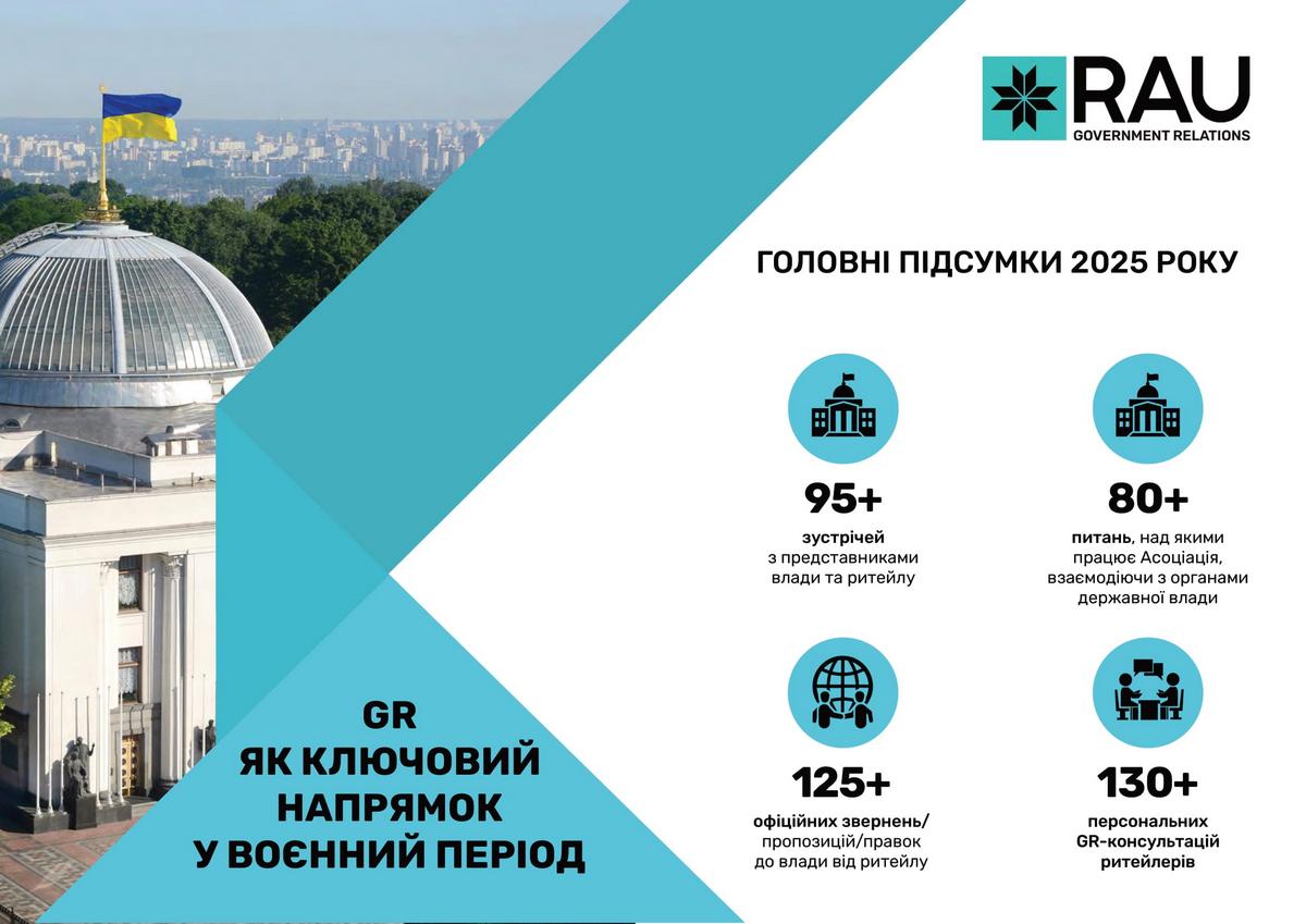 Підсумки роботи Асоціації ритейлерів України у 2025 році в цифрах та графіках: які члени та партнери приєднались до RAU, скільки статей було опубліковано, які аналітичні дослідження вдалося реалізувати, які зустрічі з владою організувала GR-команда, що було зроблено та які результати отримано.