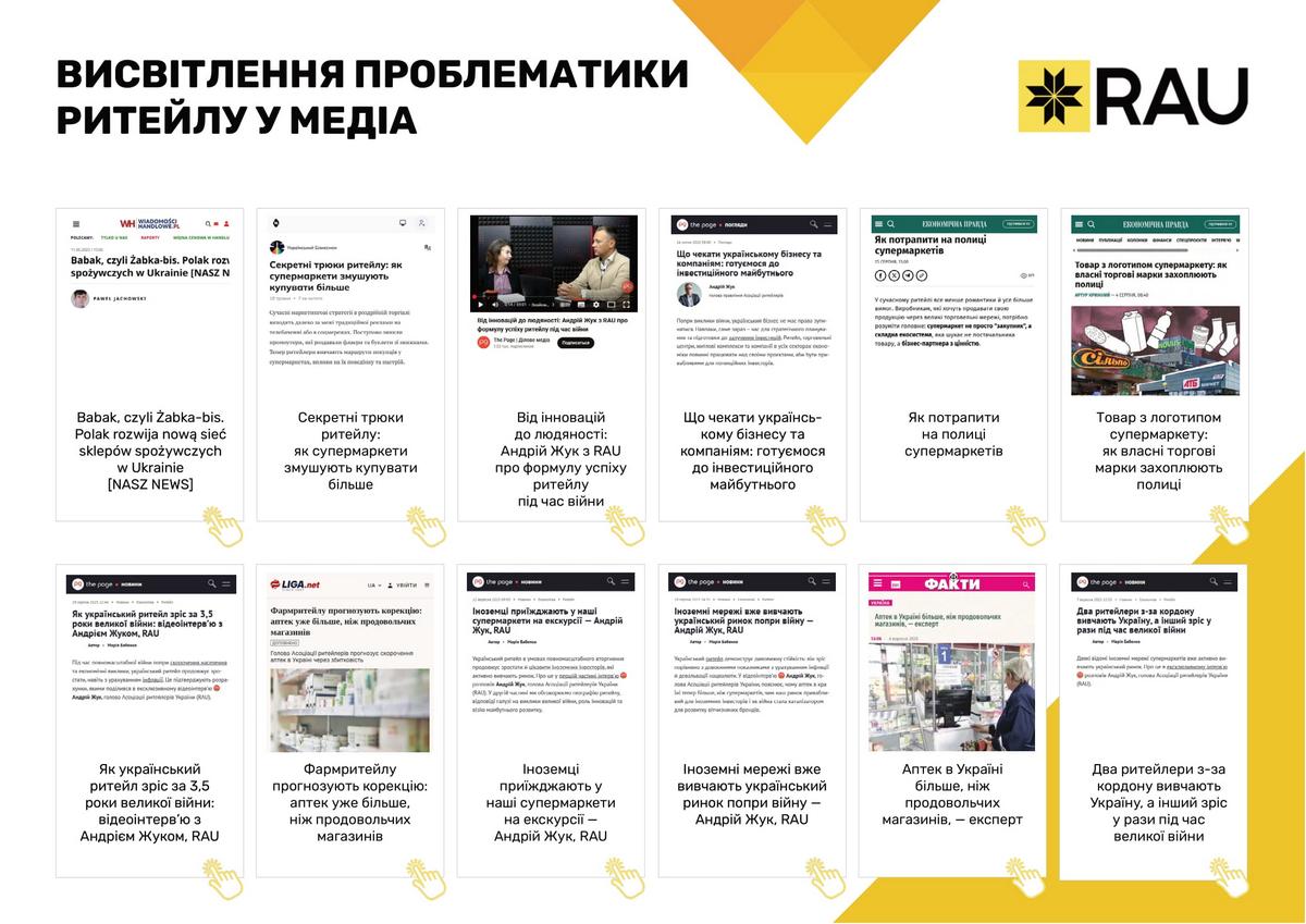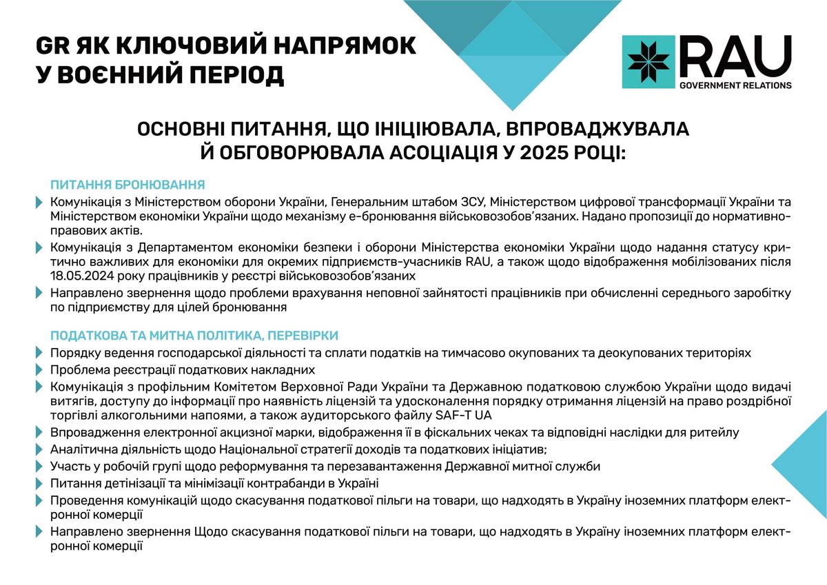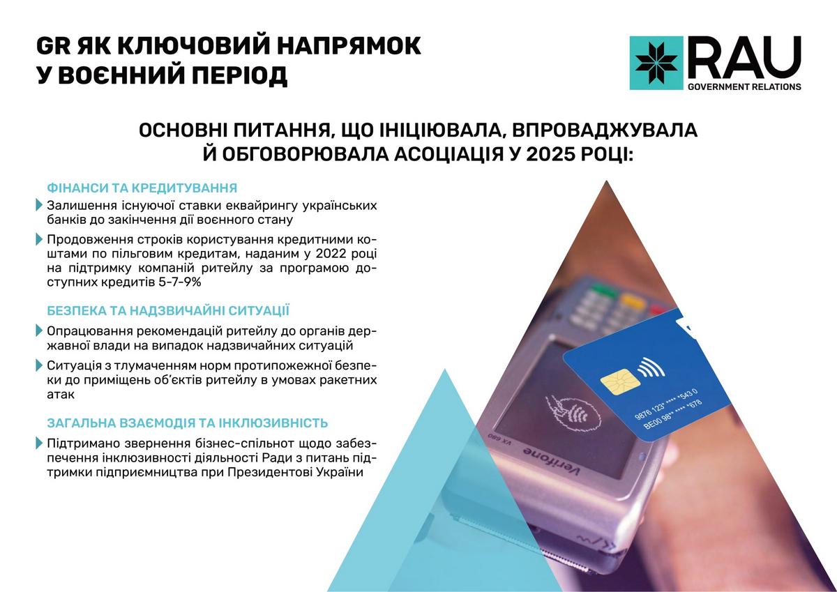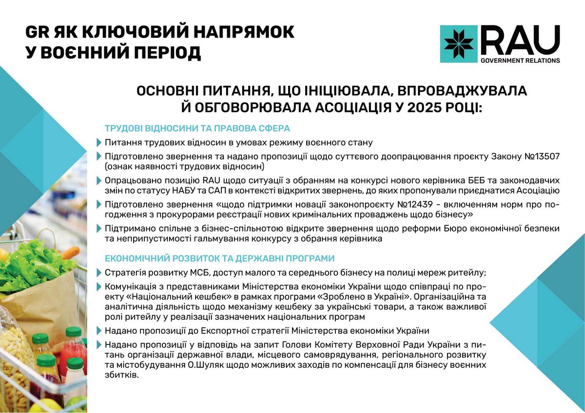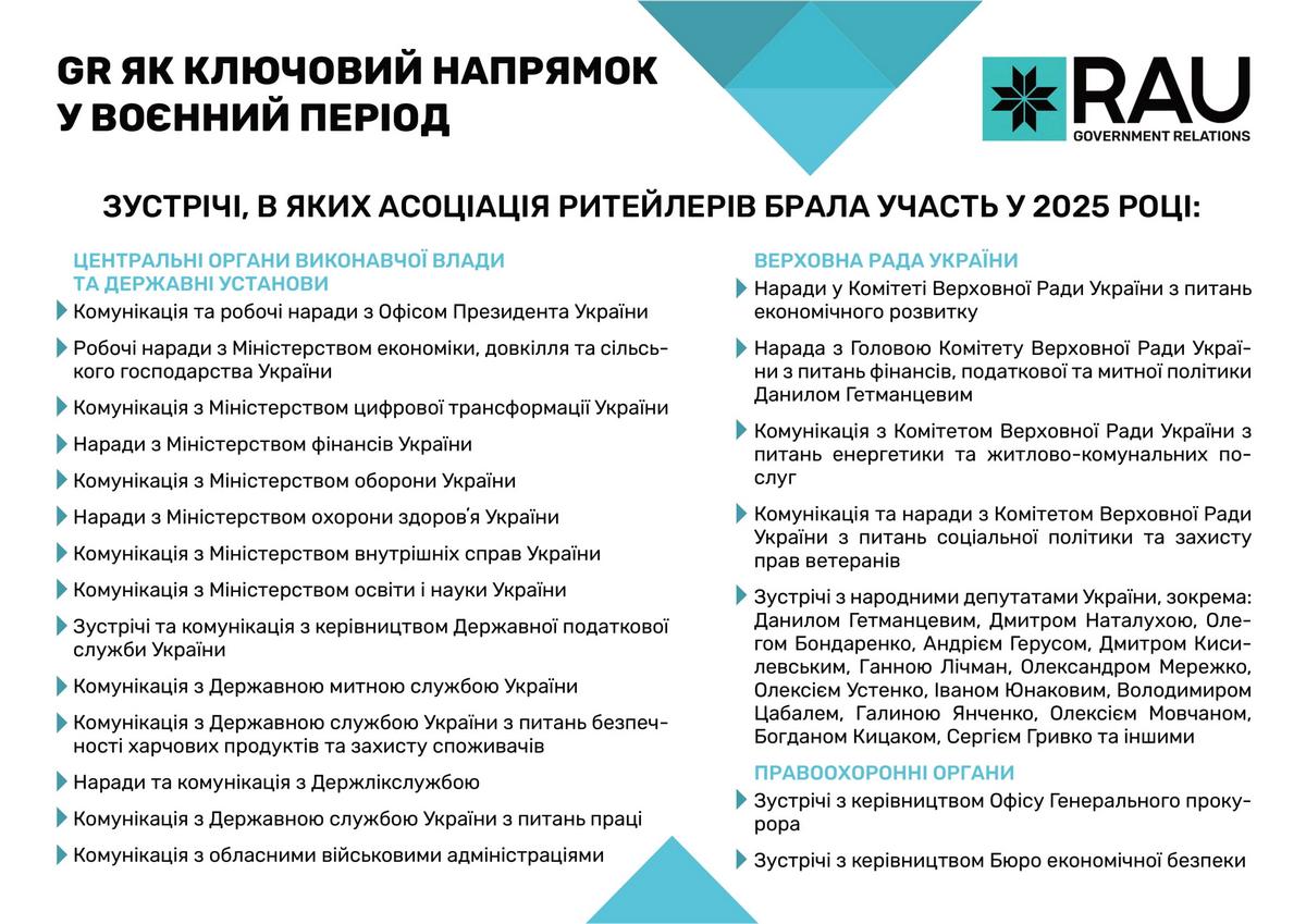 Асоціація ритейлерів України послідовно відстоювала інтереси галузі у взаємодії з органами державної влади. Спільна робота була зосереджена на спрощенні регуляторних процедур, запровадженні механізмів е-бронювання для захисту критично важливих працівників, удосконаленні законодавчого поля та ініціатив, спрямованих на забезпечення продовольчої безпеки, розвиток інфраструктури й створення сприятливих умов для розвитку ритейлу в Україні. Підтримка Збройних Сил України та співпраця з громадами залишаються незмінними пріоритетами. За понад три роки війни українські ритейлери передали допомоги на суму понад 18,1 млрд грн.